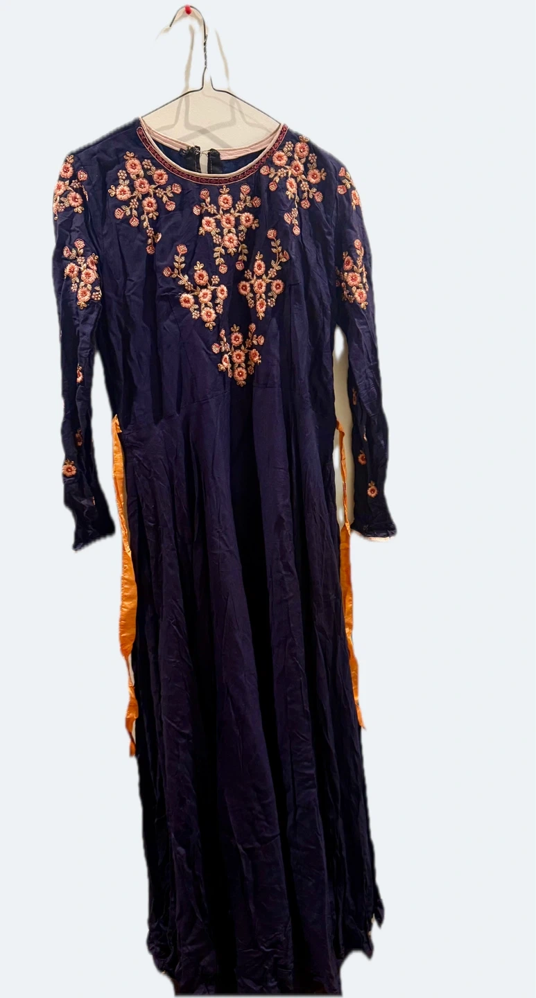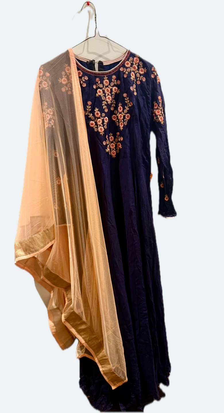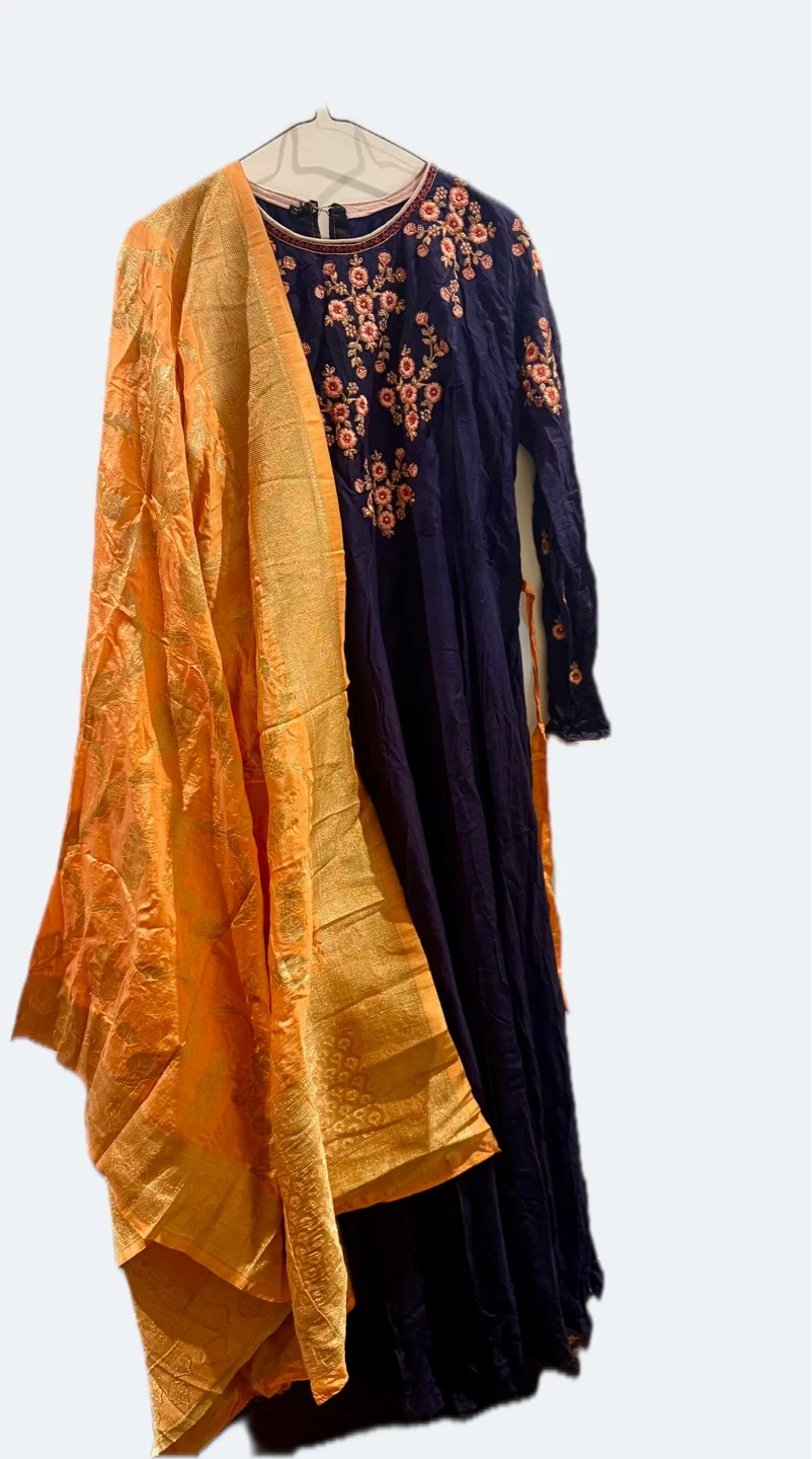 This navy blue Anarkali suit features intricate floral embroidery on the bodice and sleeves. It comes with a vibrant orange dupatta, also adorned with golden border details. The fabric appears to be lightweight and flowy.