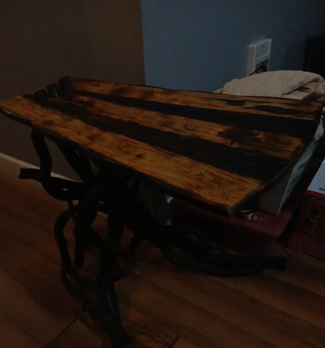 This coffee table features a striking wood slab top with contrasting dark and light wood planks. It's supported by an artistic base made of twisted dark ivy vine wood. It's a handmade, custom 1 of 1 piece. Would love to keep it but dont have the room so my loss your gain.
