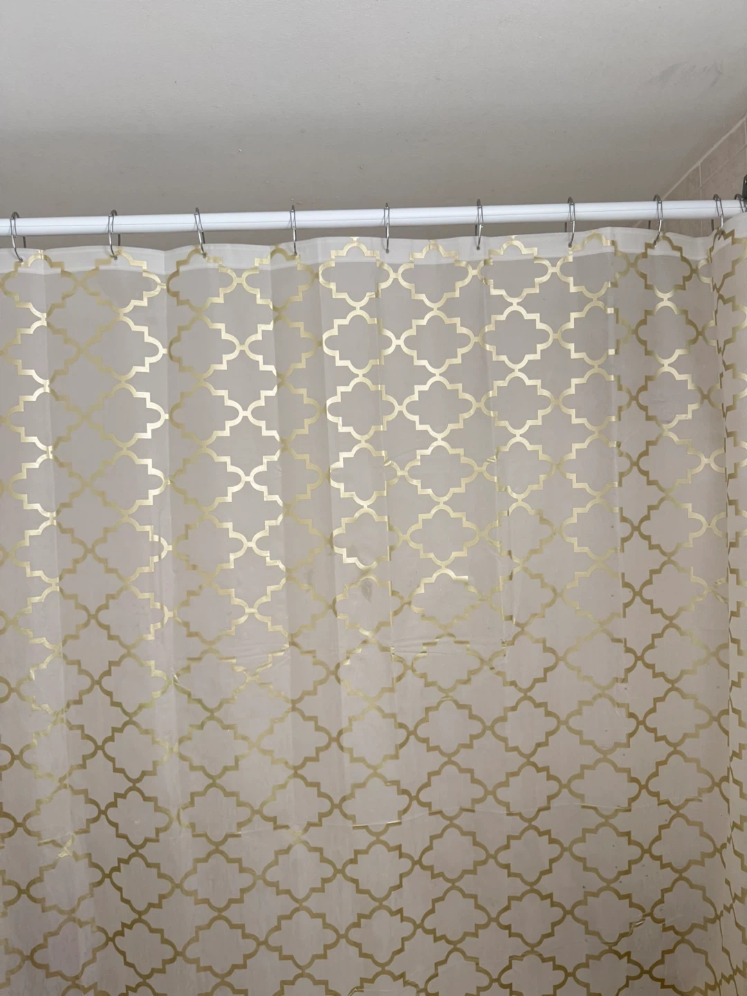 Selling a shower curtain with a gold geometric pattern. It's in great condition and would add a nice touch to any bathroom! The material feels durable and the pattern is eye-catching