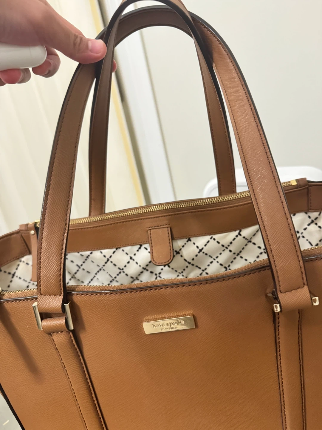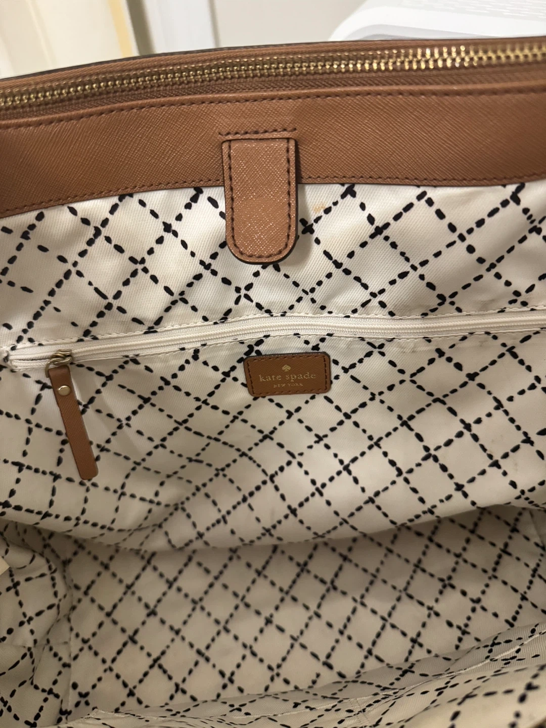 This is a brown Kate Spade leather tote bag. It has a zip-top closure and interior pockets. The interior lining features a black and white diamond pattern. It's a stylish and practical bag for everyday use!