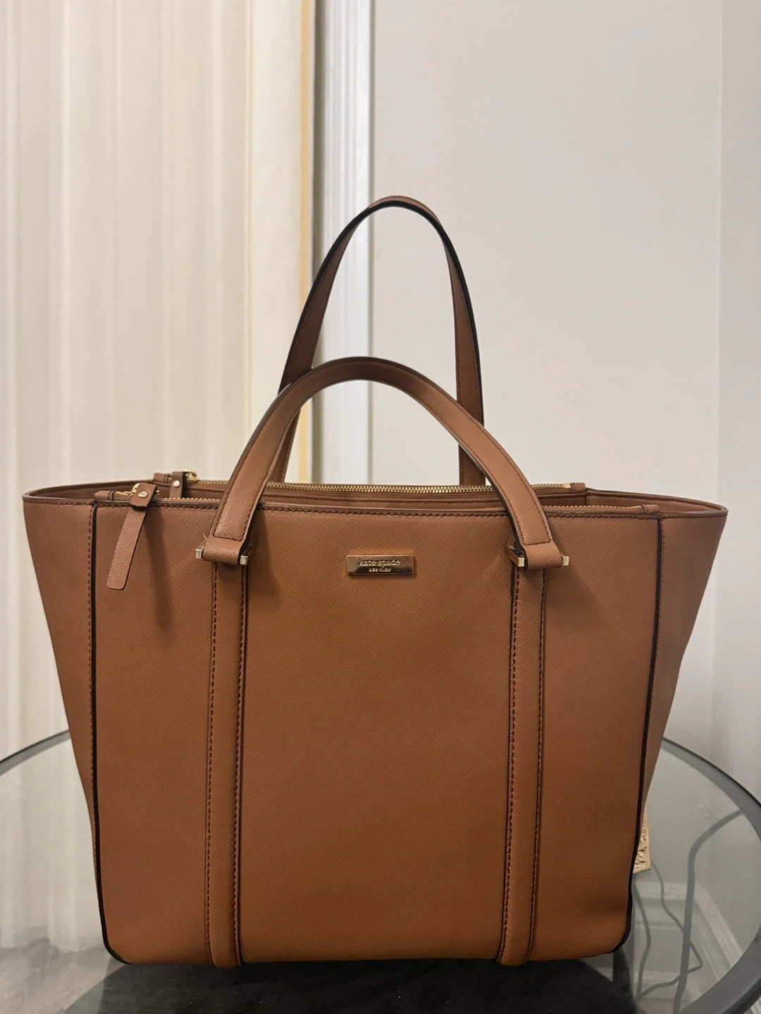 This is a brown Kate Spade leather tote bag. It has a zip-top closure and interior pockets. The interior lining features a black and white diamond pattern. It's a stylish and practical bag for everyday use!