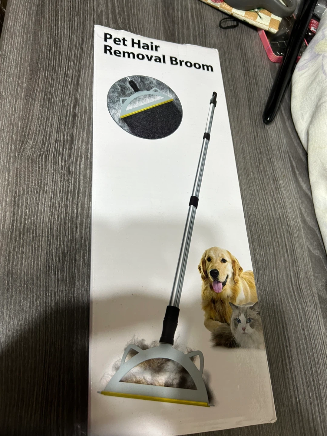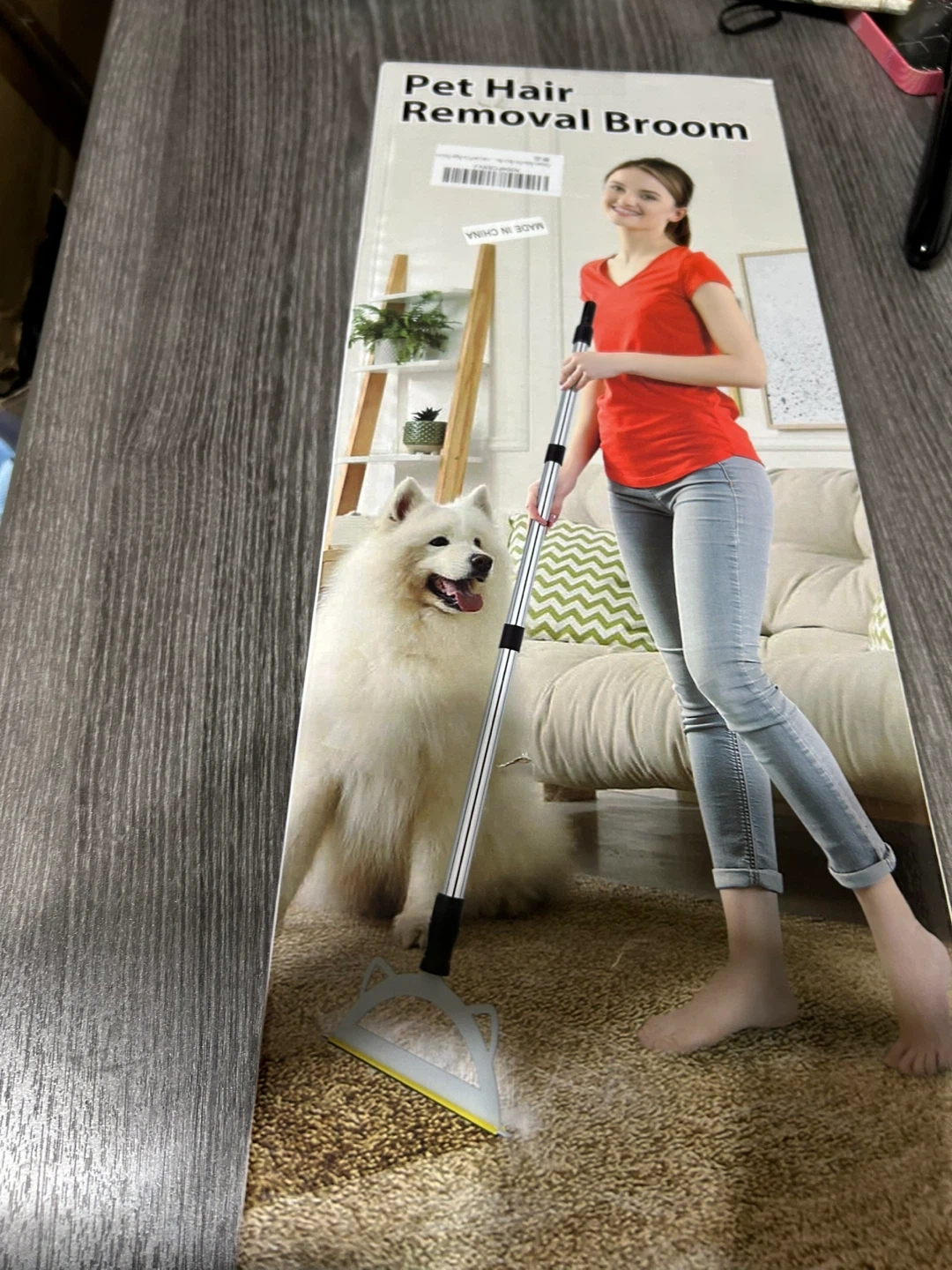 This new broom is designed for effective pet hair removal. It features an extendable handle for comfortable use. Also includes a squeegee attachment for glass surfaces. It's suitable for carpets, rugs, and low pile stairs.