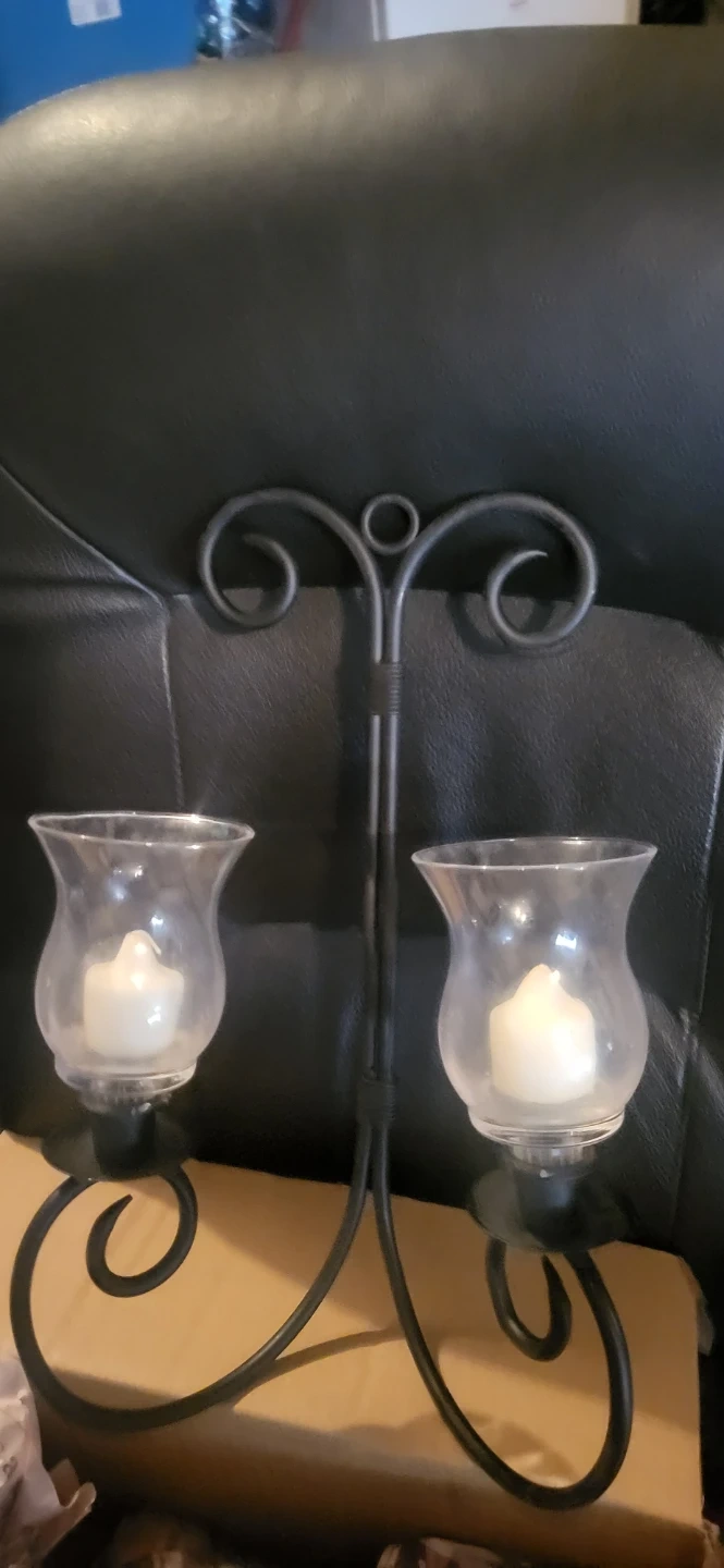This decorative metal candelabra holds two hurricane glass shades. Each shade contains a white wax candle. It's designed with elegant scrollwork for a classic look. 1 set of 2.