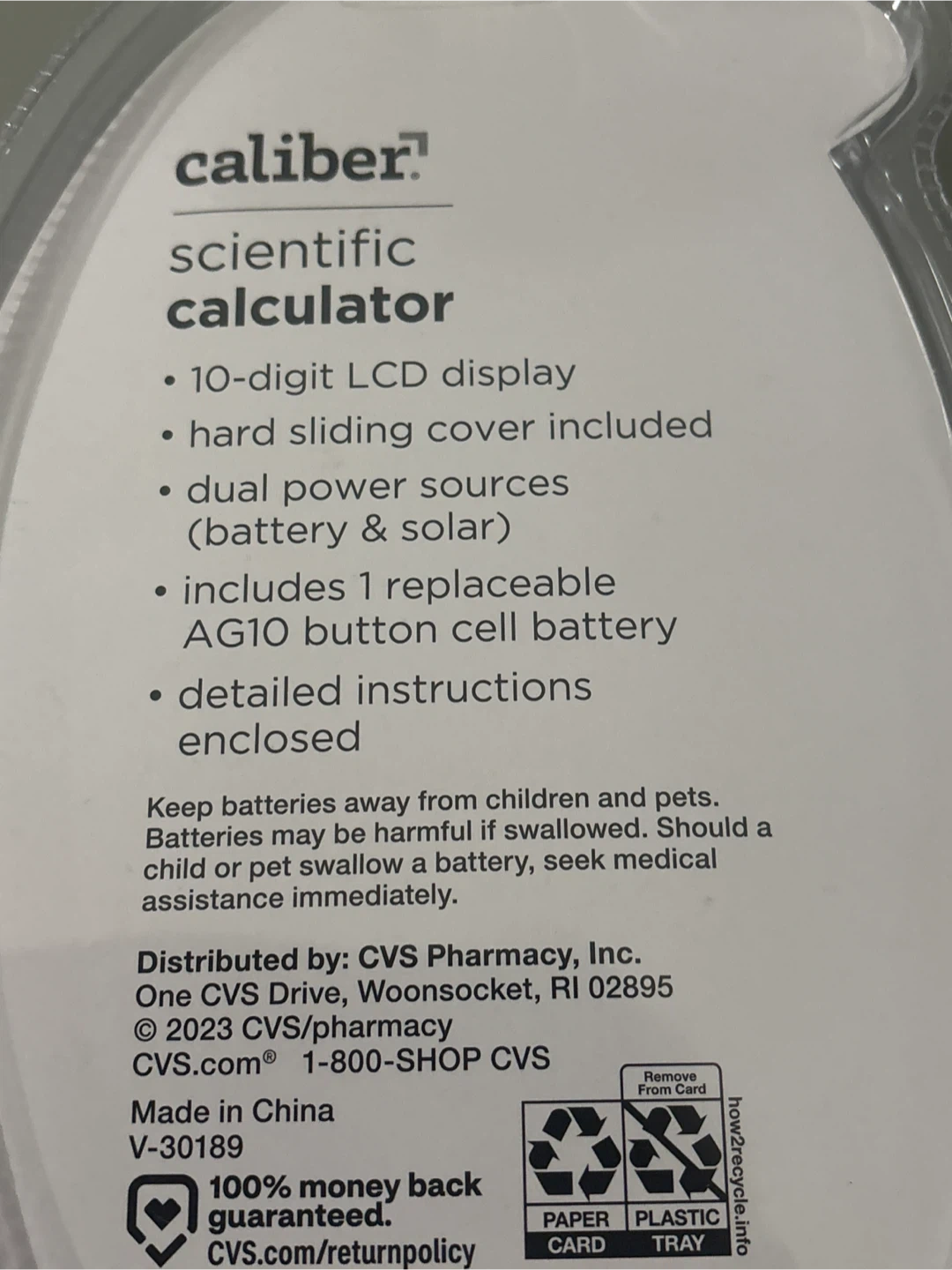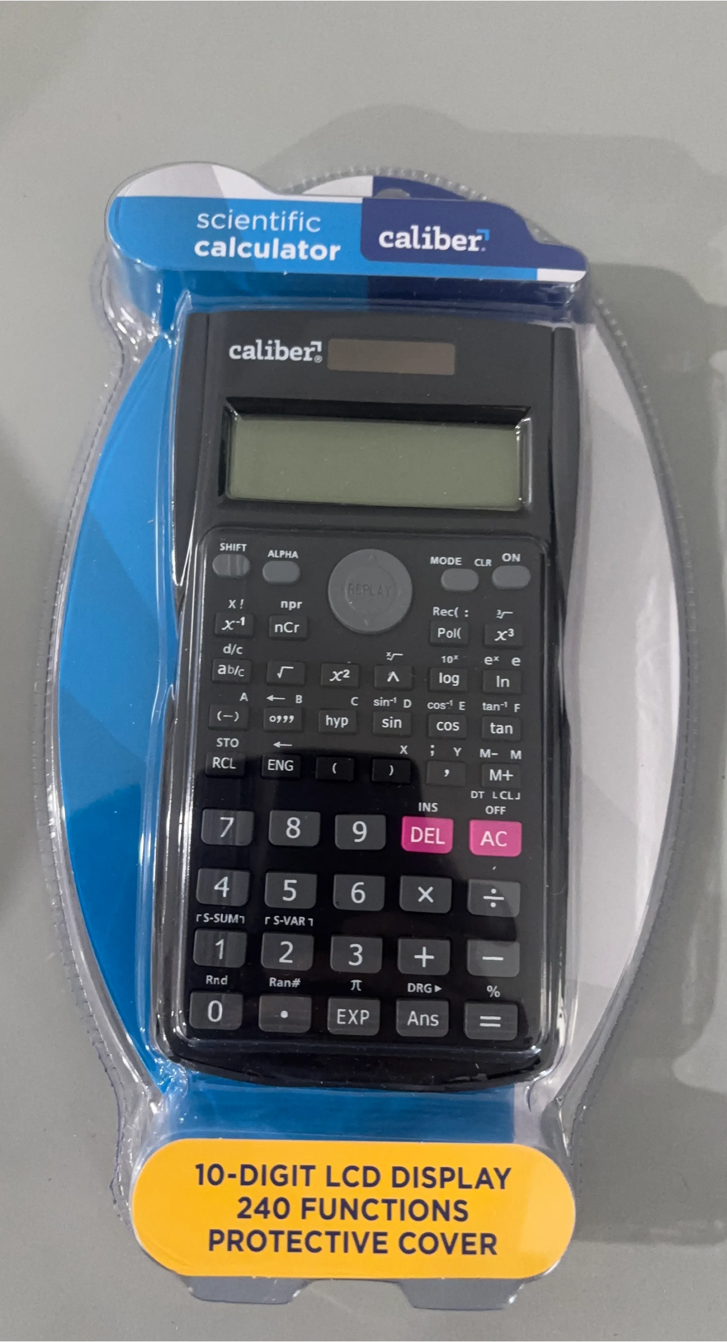 This Caliber scientific calculator features a 10-digit LCD display and 240 functions. It includes dual power sources (battery & solar) and a hard sliding cover. A replaceable AG10 button cell battery and detailed instructions are enclosed.