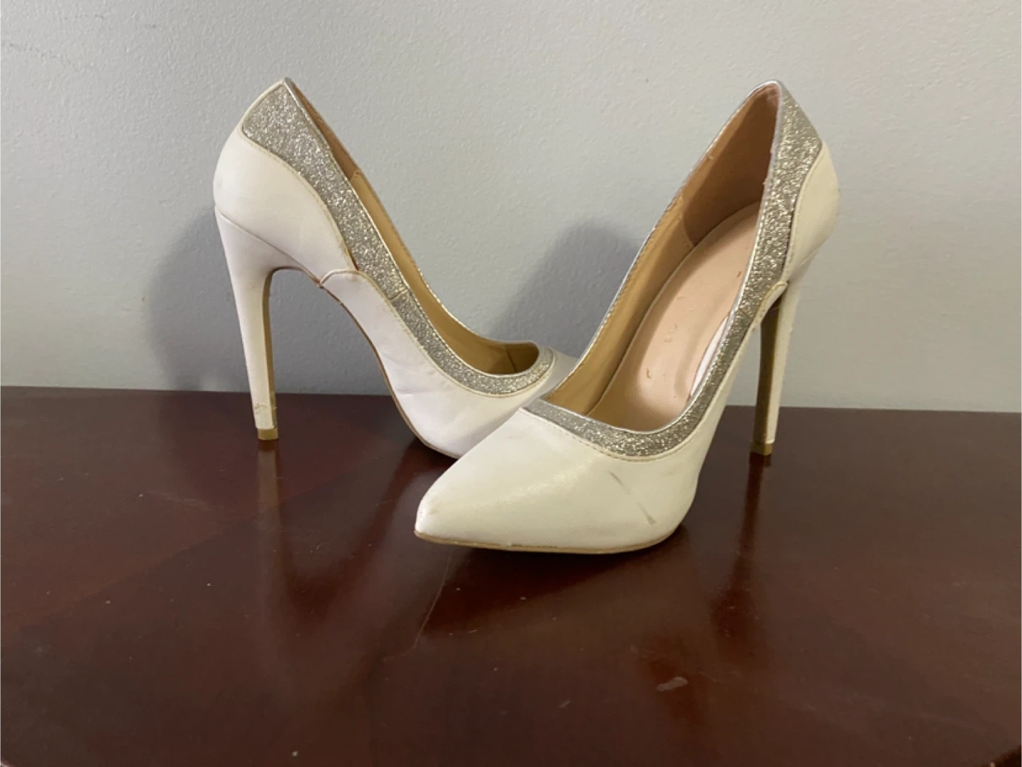 Stylish white stiletto heels from Wild Diva Lounge. They feature a chic glitter trim accent for a touch of sparkle. Perfect for dressing up any outfit!