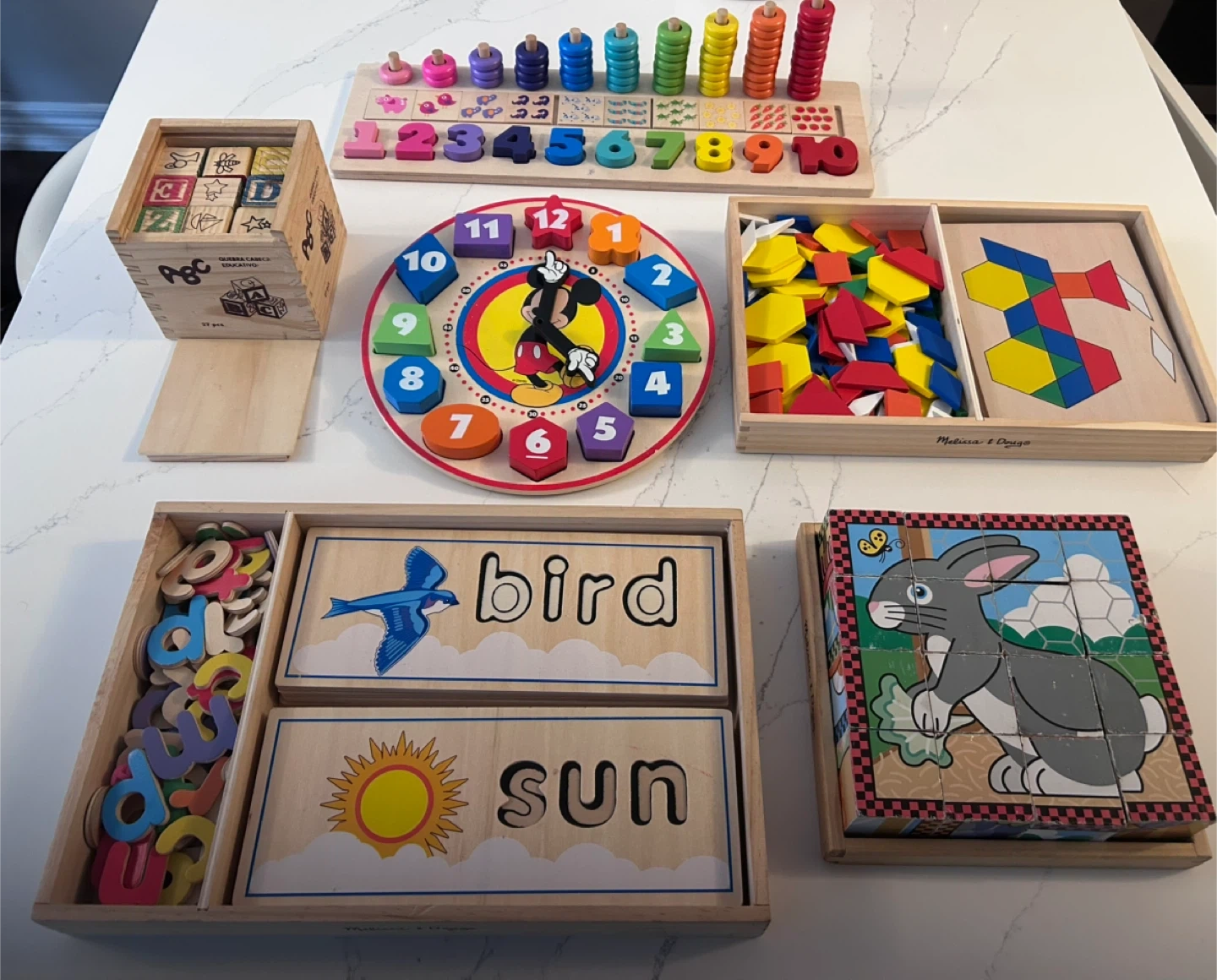 This 6 item bundle includes several Melissa & Doug wooden educational toys. You'll find alphabet blocks, a counting abacus, a number board, shape sorters, word building tiles for 'bird' and 'sun' etc, and a classic Mickey Mouse clock. Great for early learning and play!