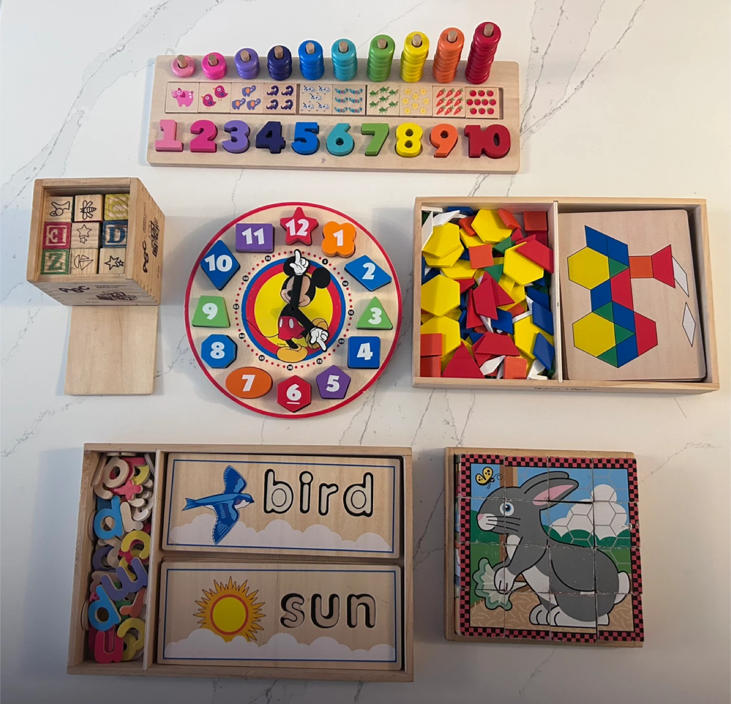 This 6 item bundle includes several Melissa & Doug wooden educational toys. You'll find alphabet blocks, a counting abacus, a number board, shape sorters, word building tiles for 'bird' and 'sun' etc, and a classic Mickey Mouse clock. Great for early learning and play!
