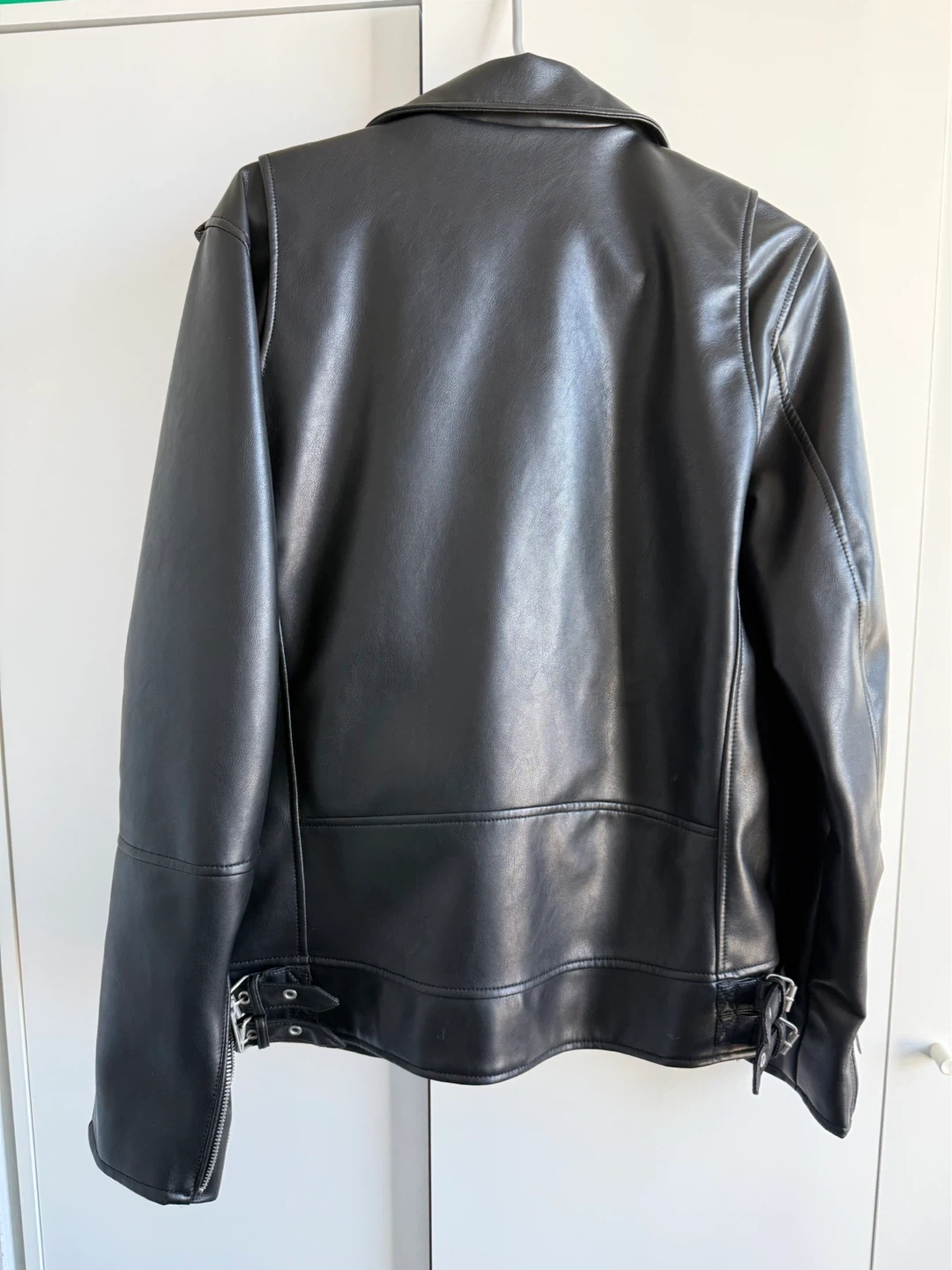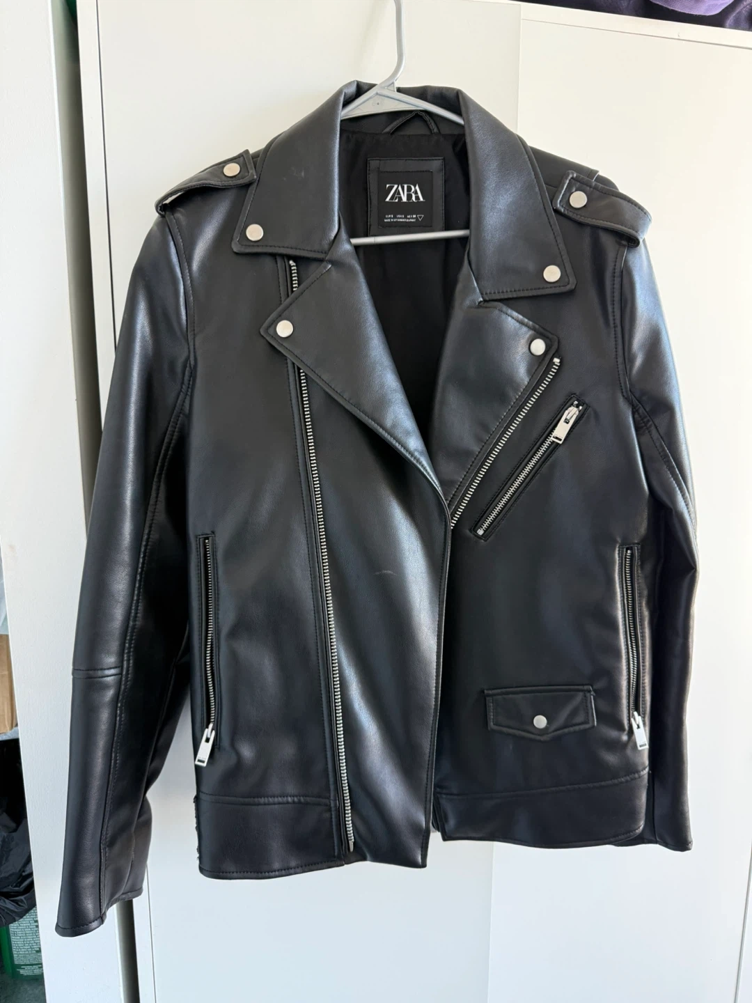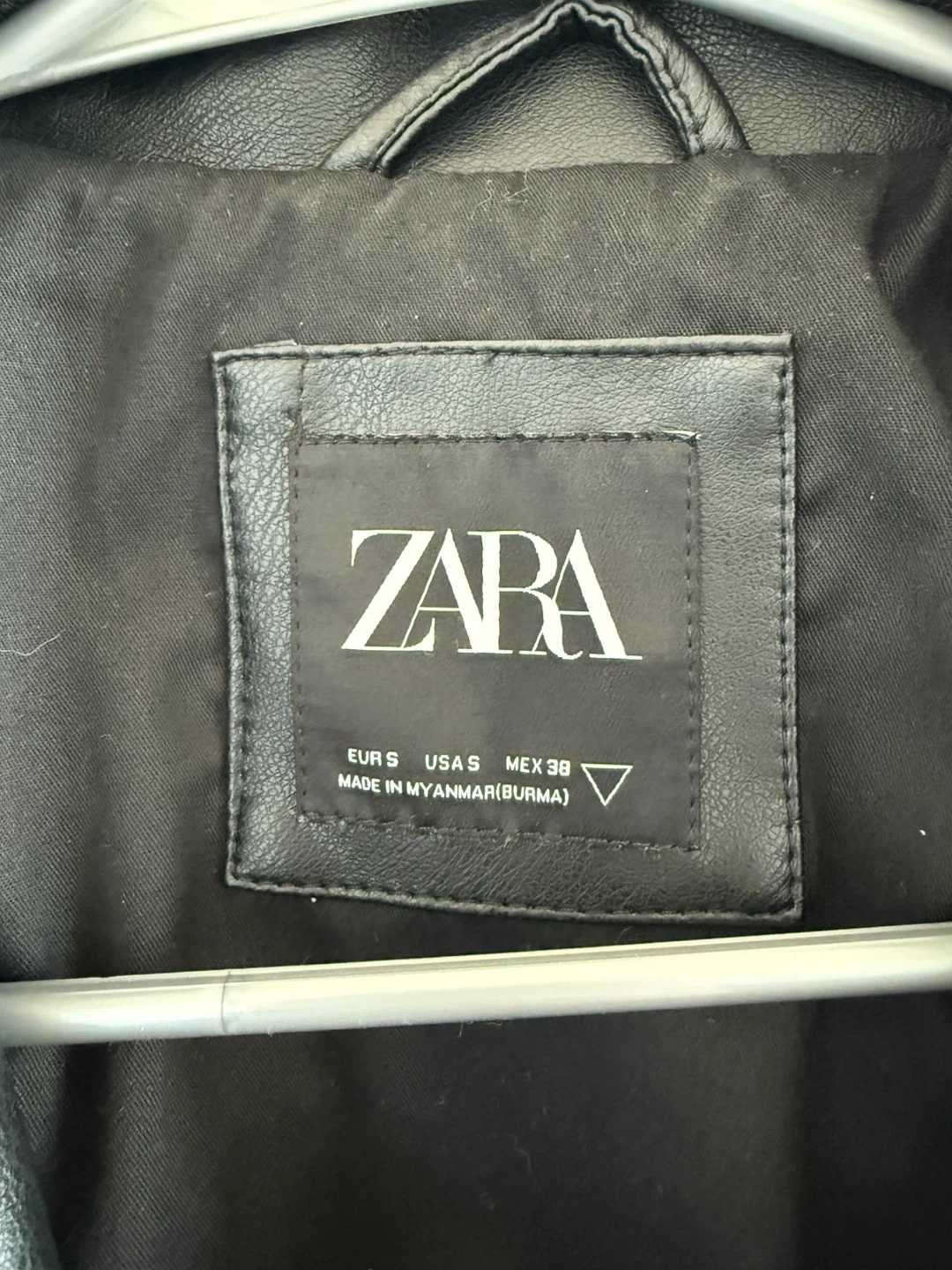 Classic ZARA moto jacket in black. Faux leather material. Size is S (EUR S, US S, MEX 38). Made in Myanmar.