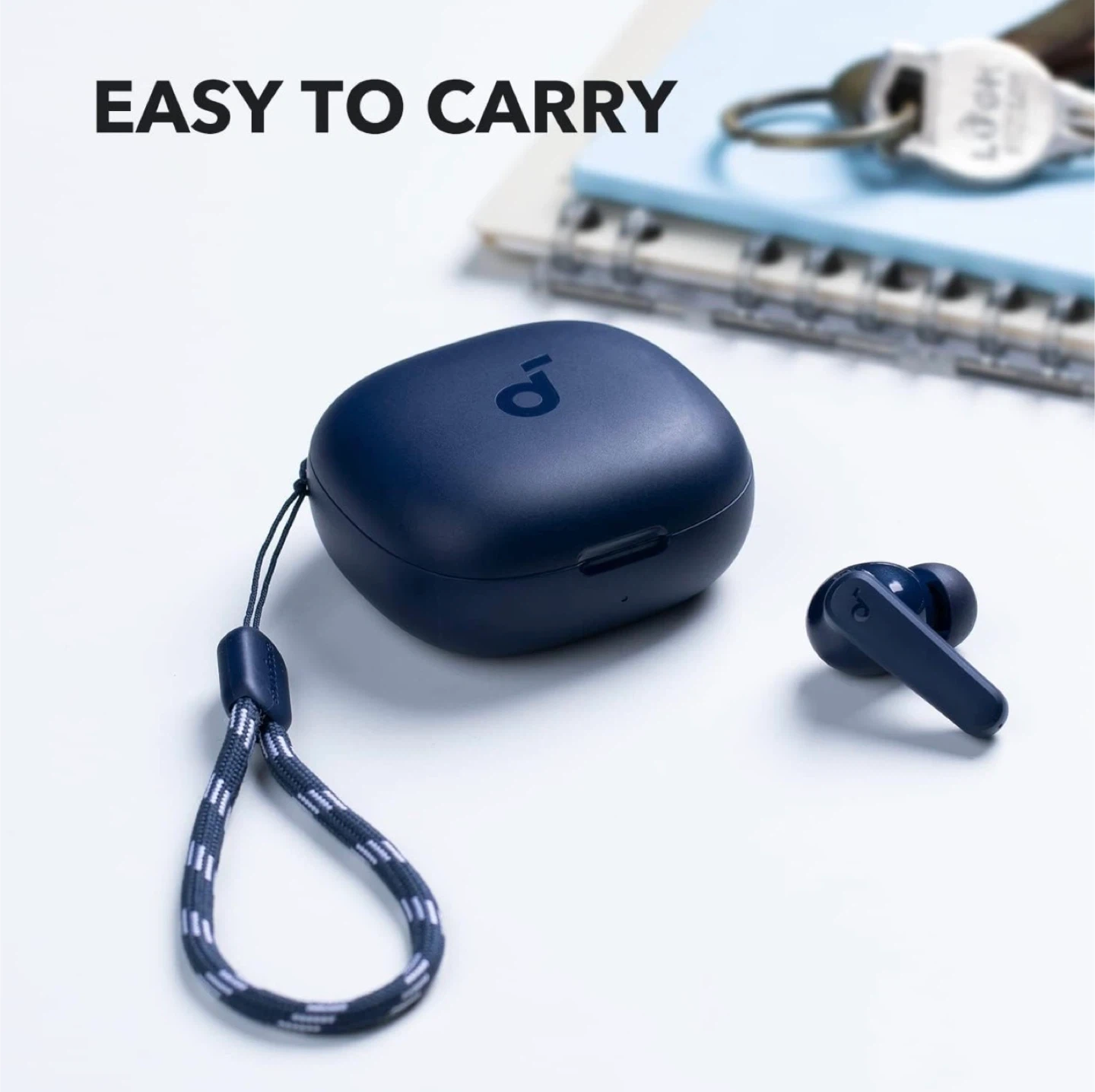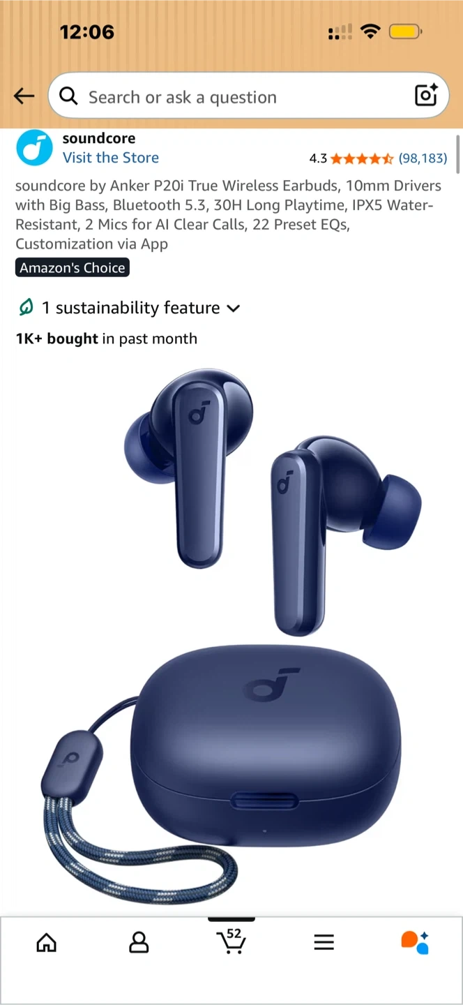 Anker Soundcore P20i true wireless earbuds in navy blue. Offers 10 hours of playtime on a single charge, with 30 hours total with the charging case. Features Bluetooth 5.3 and IPX5 water resistance. You can customize controls and EQ settings via the app.