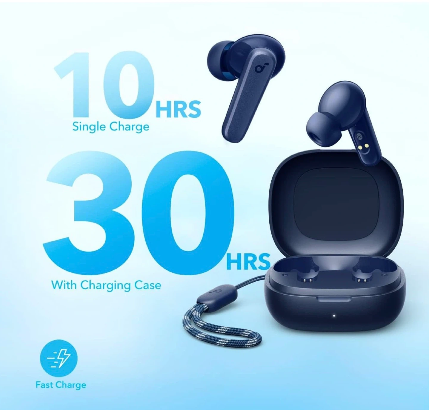 Anker Soundcore P20i true wireless earbuds in navy blue. Offers 10 hours of playtime on a single charge, with 30 hours total with the charging case. Features Bluetooth 5.3 and IPX5 water resistance. You can customize controls and EQ settings via the app.