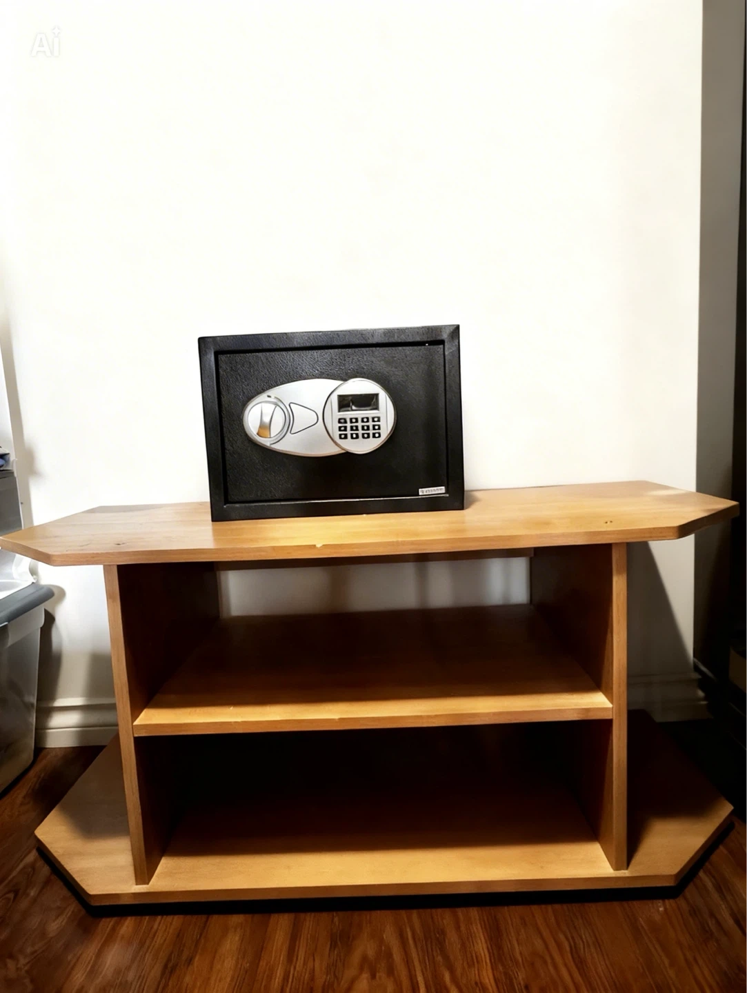 Black digital safe with keypad entry. Includes a manual override key. It's a sturdy option for home or office security. Perfect for storing important documents or valuables. table size : 95x40x44