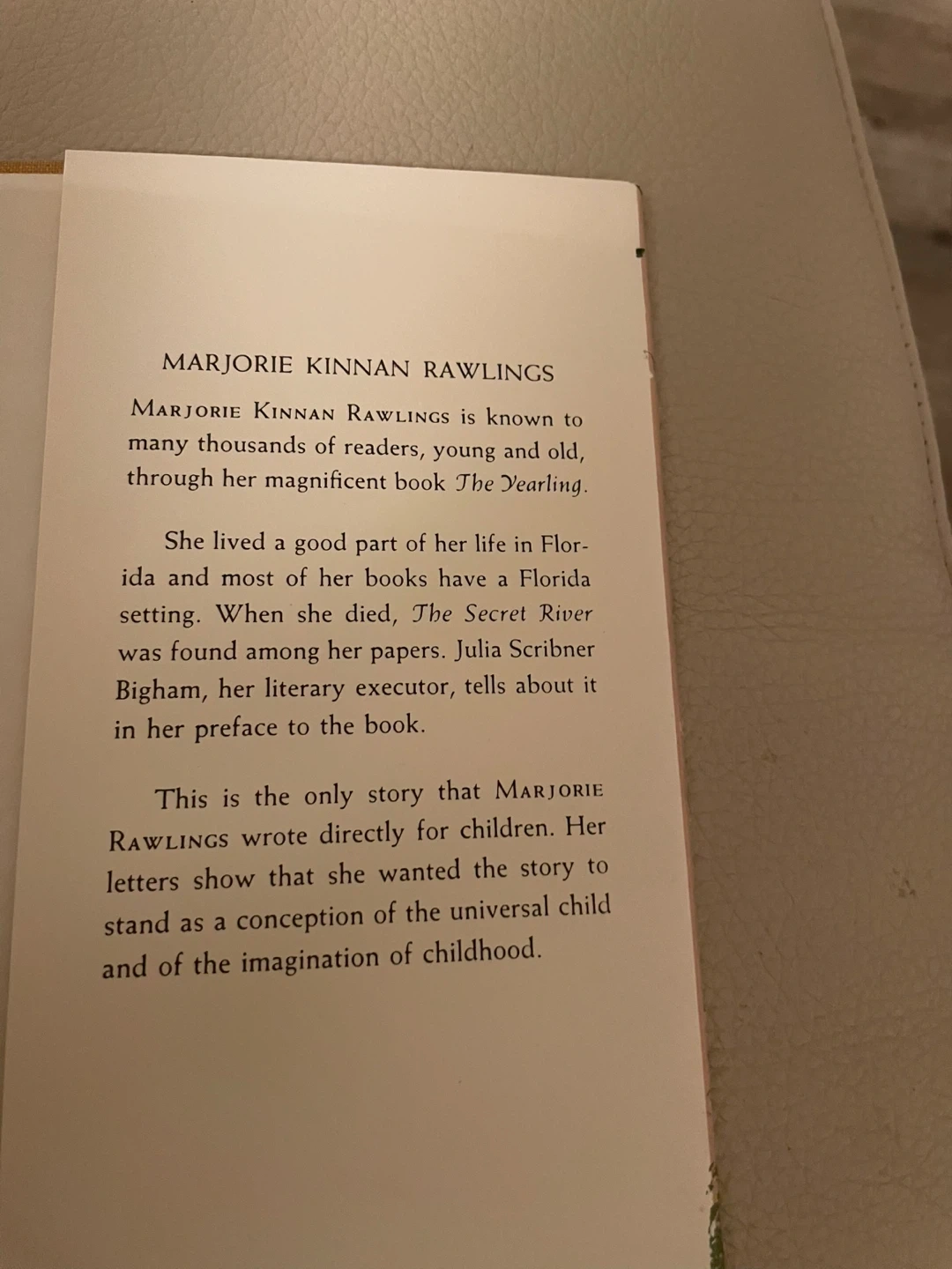 This is Marjorie Kinnan Rawlings' only story written directly for children. It's about a little girl named Calpurnia who finds a secret river in the forest. The story explores themes of imagination and childhood.