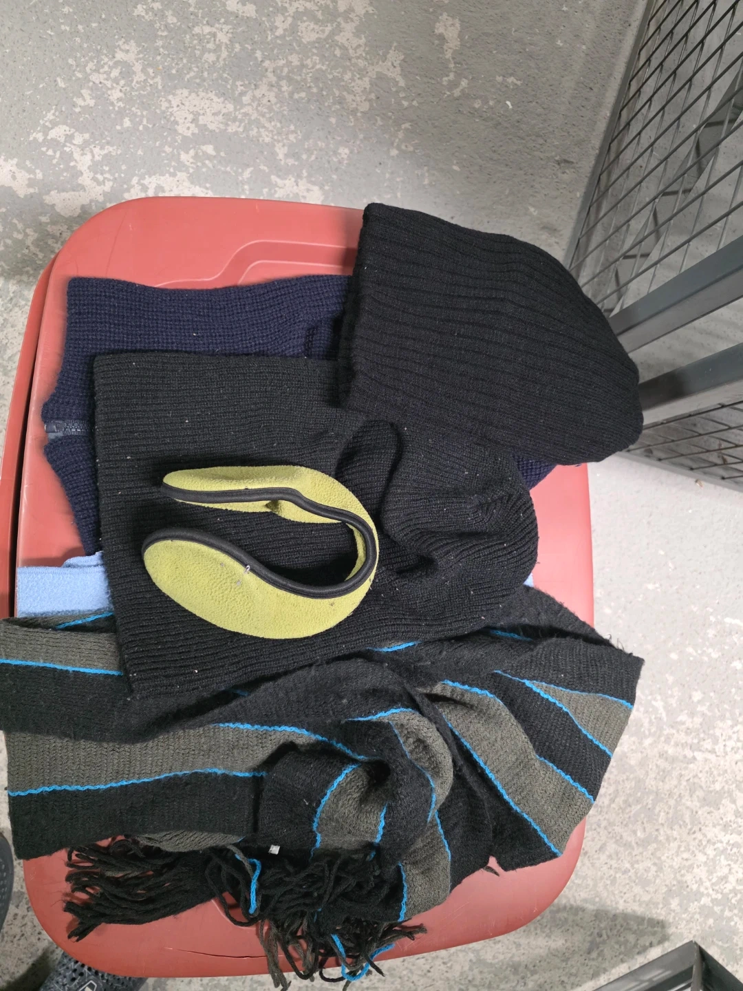 a collection of winter accessories! Includes a black toque, a striped scarf with blue accents, and a pair of earmuffs. Great for keeping warm during the colder months!