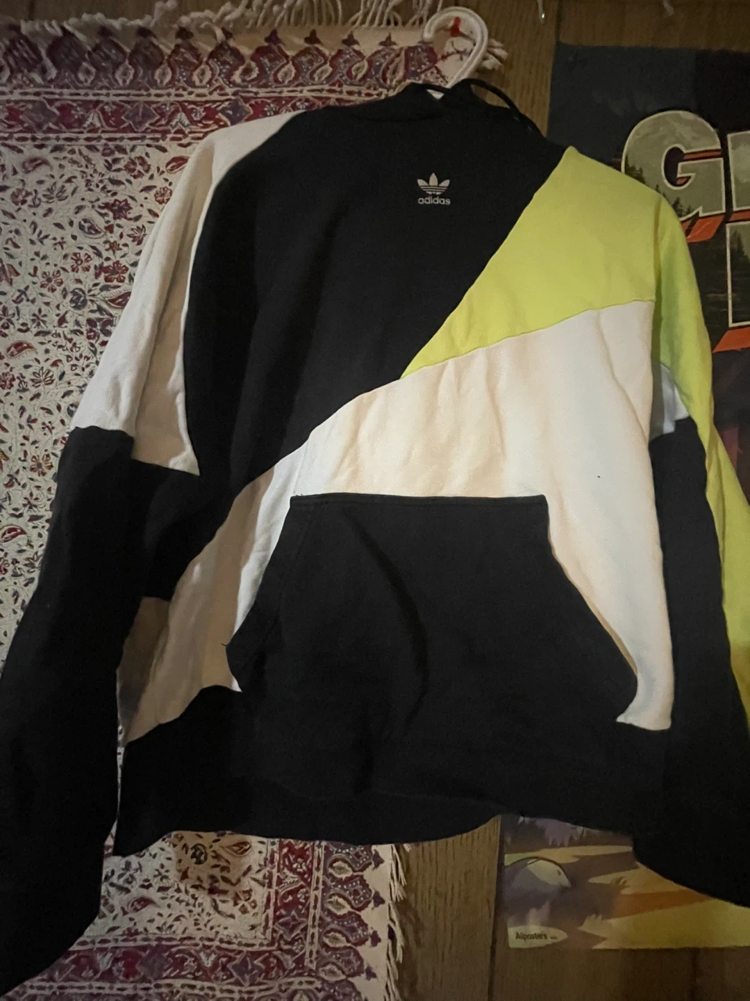 This Adidas hoodie features a bold colour block design in black, white, and neon yellow. It's a size medium with a front kangaroo pocket.