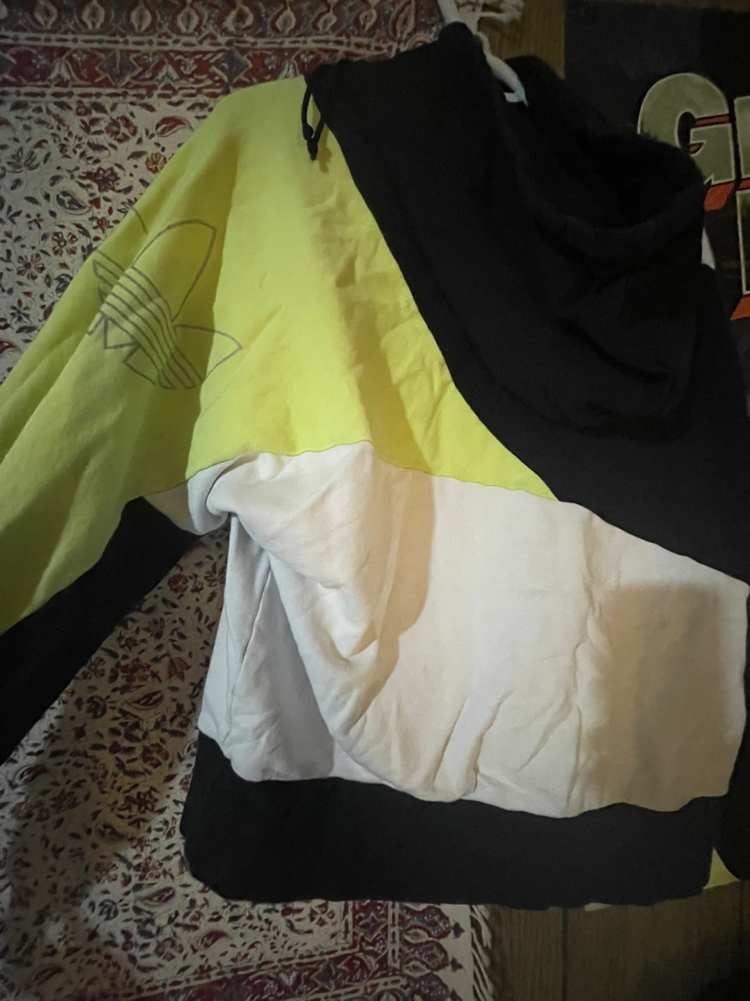 This Adidas hoodie features a bold colour block design in black, white, and neon yellow. It's a size medium with a front kangaroo pocket.