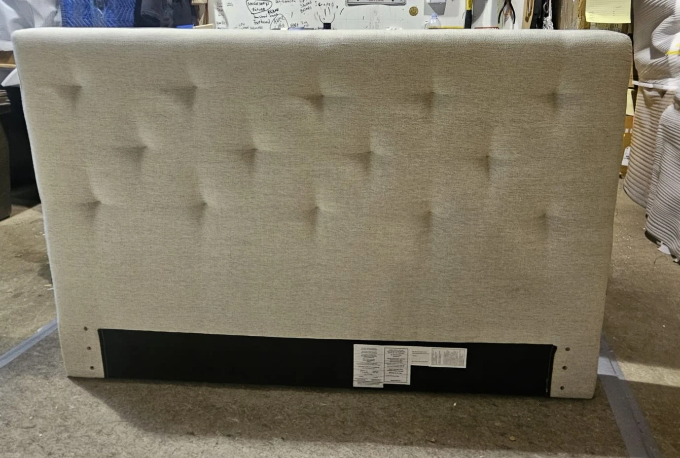 This tufted upholstered full headboard bed is a neutral beige color. It features diamond button tufting for a classic look. This headboard provides a stylish and comfortable backdrop for your bed.