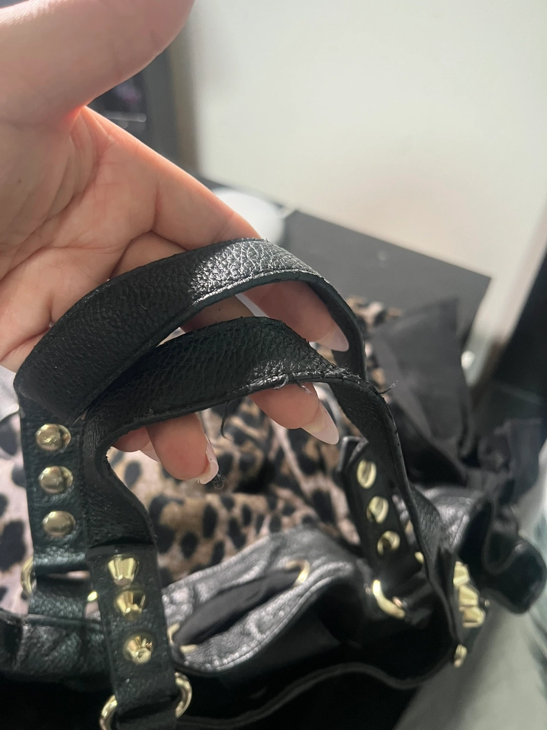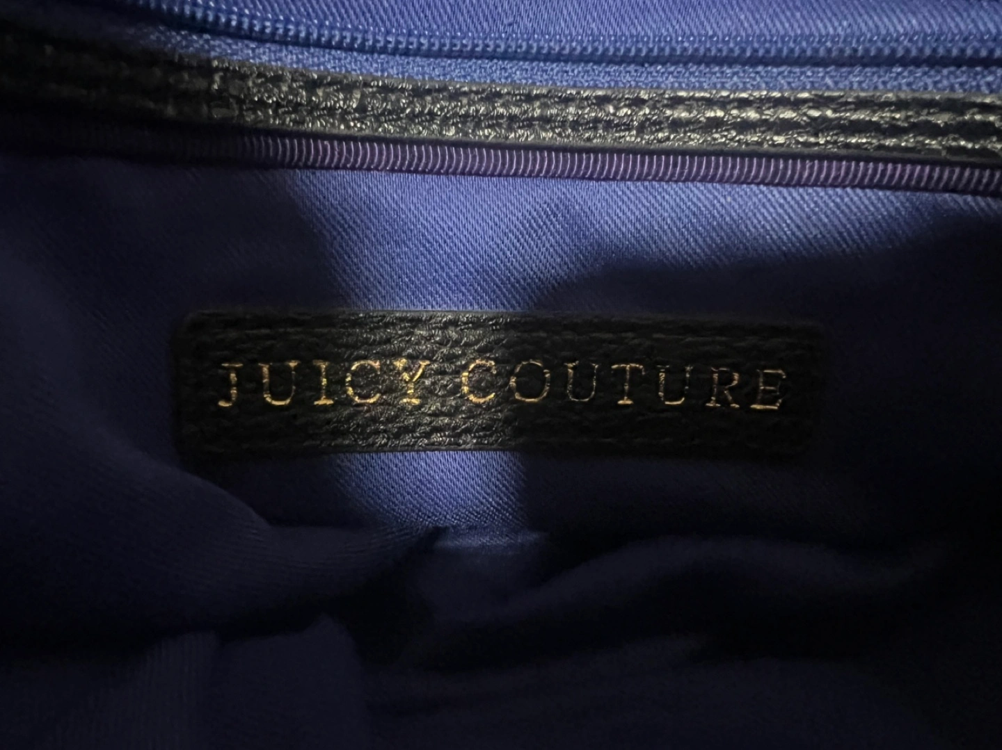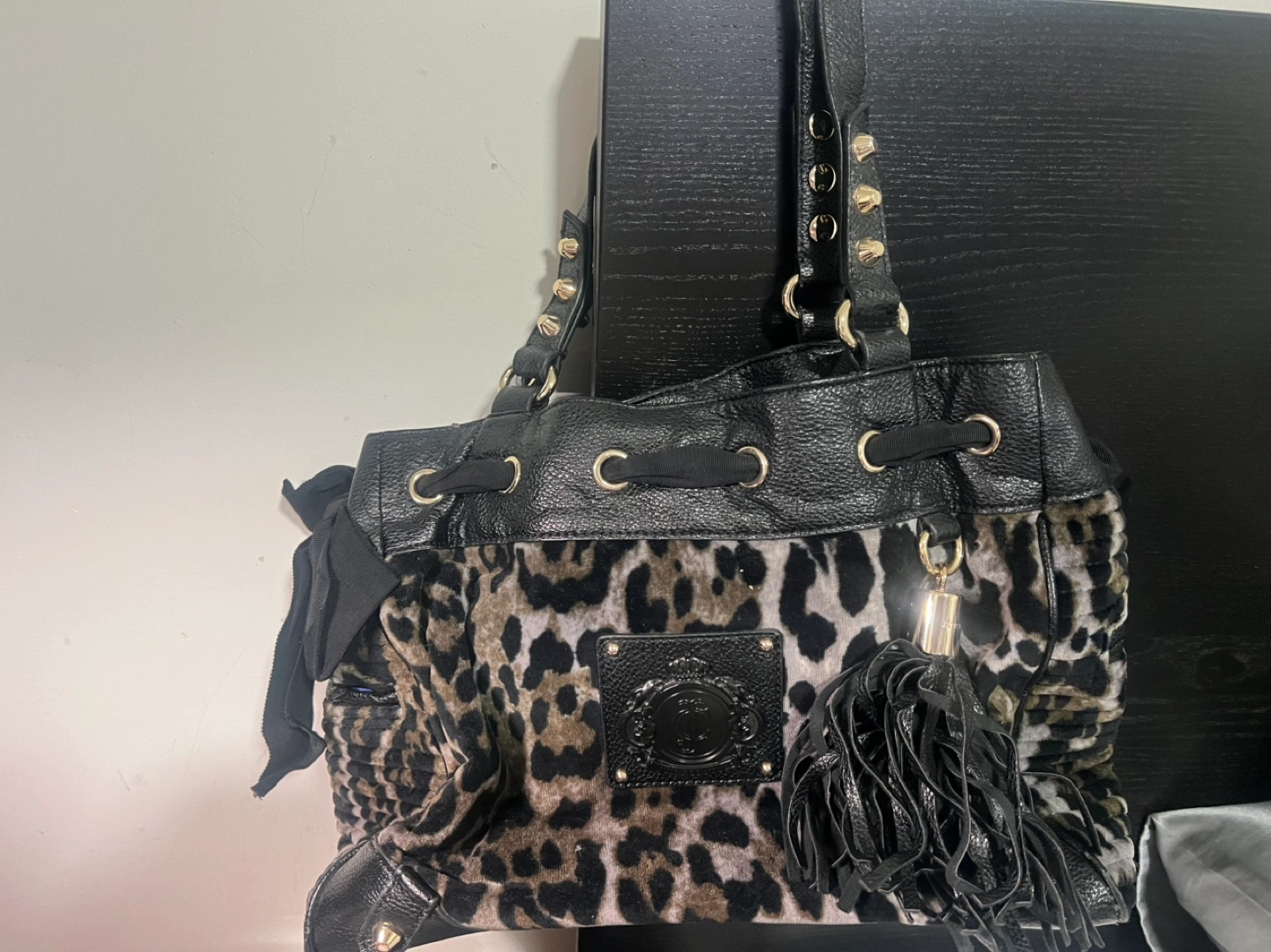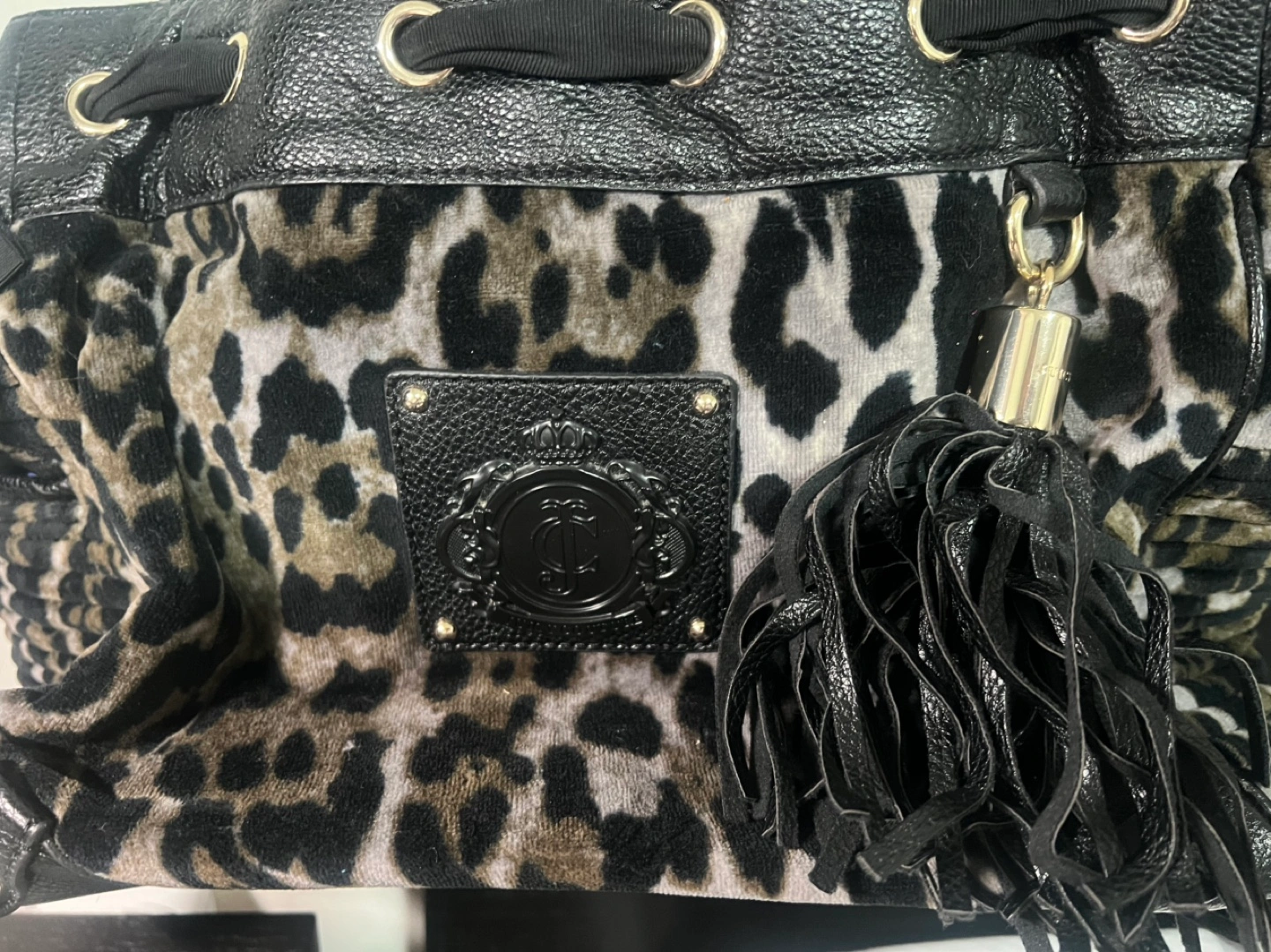 Pre-owned Juicy Couture handbag. Leopard print exterior, black leather trim. Features gold-toned hardware and a black tassel. Minor wear visible.