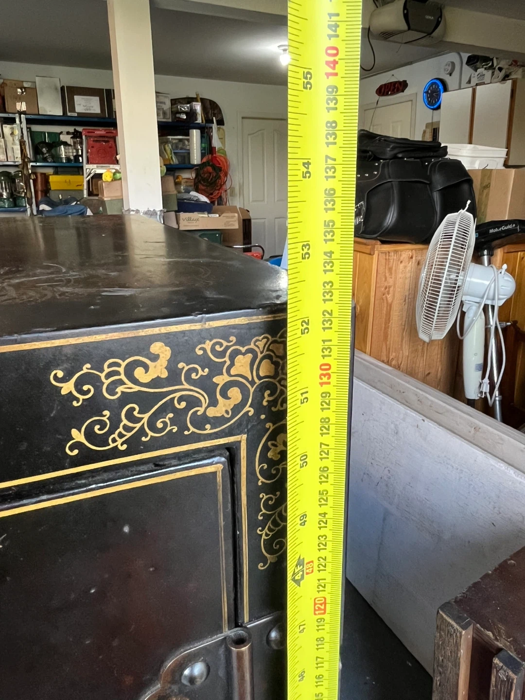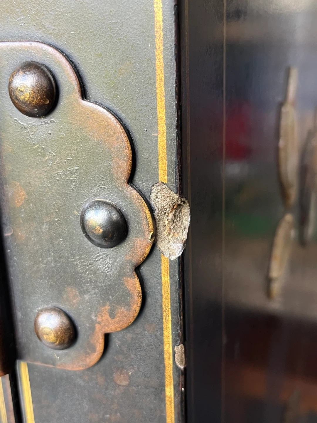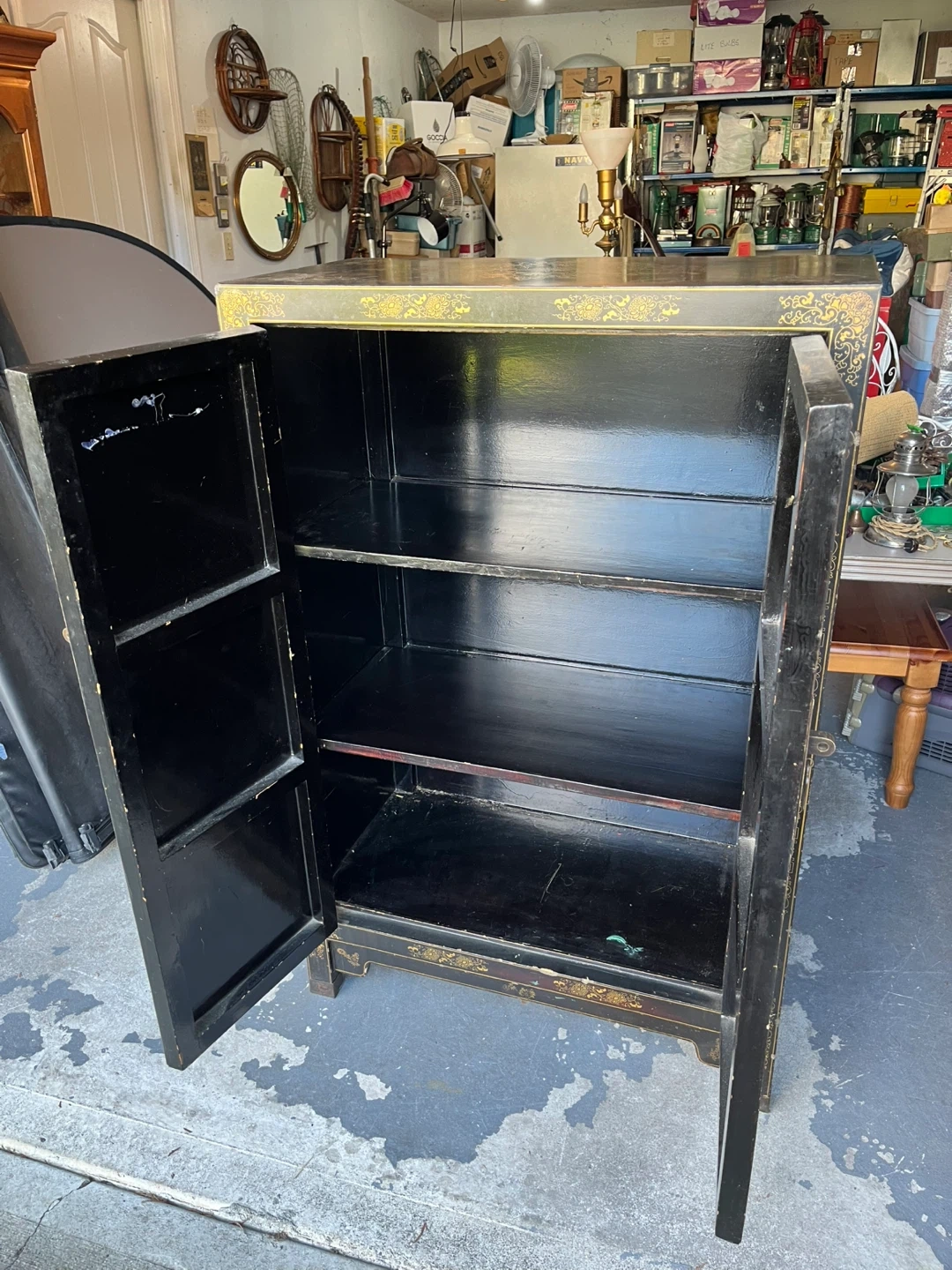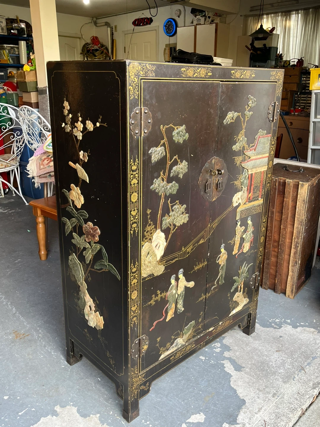Black Lacquered Chinese Cabinet with Carved Stone Inlay. Cabinet has a bit of damage on some spots but nothing major.