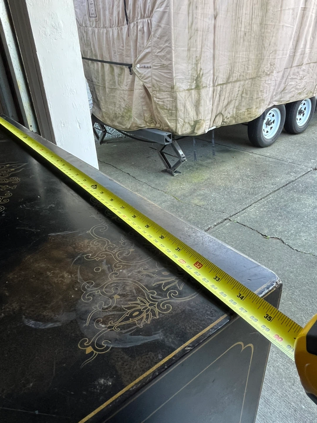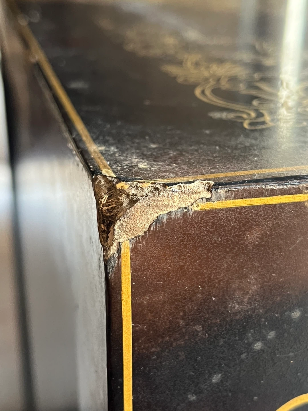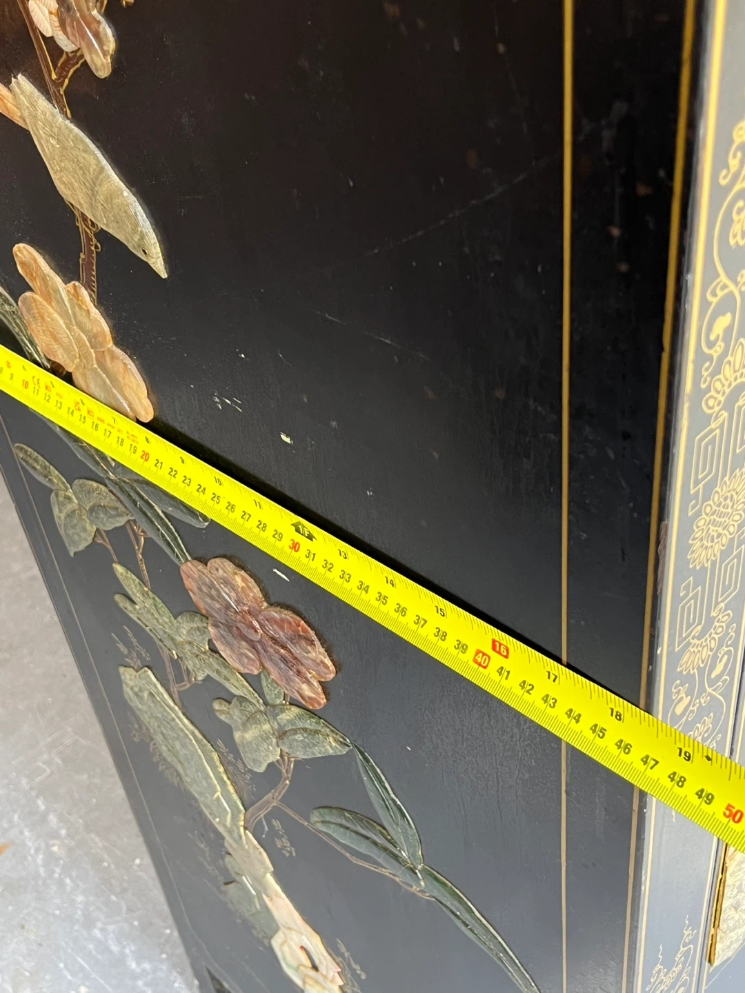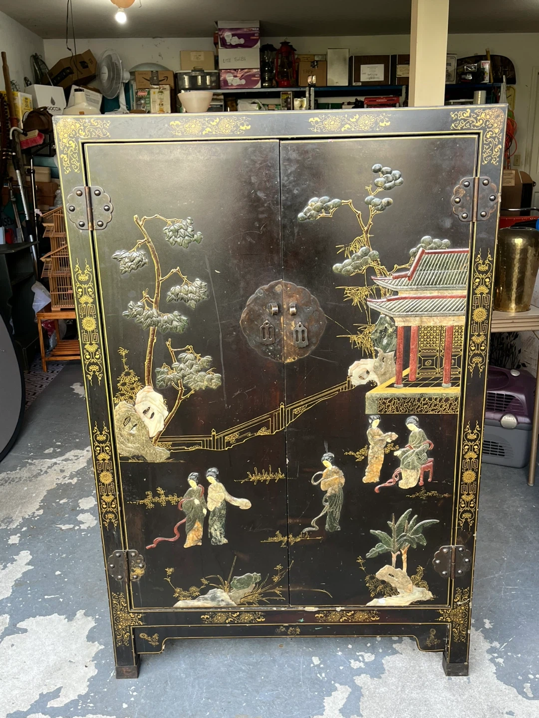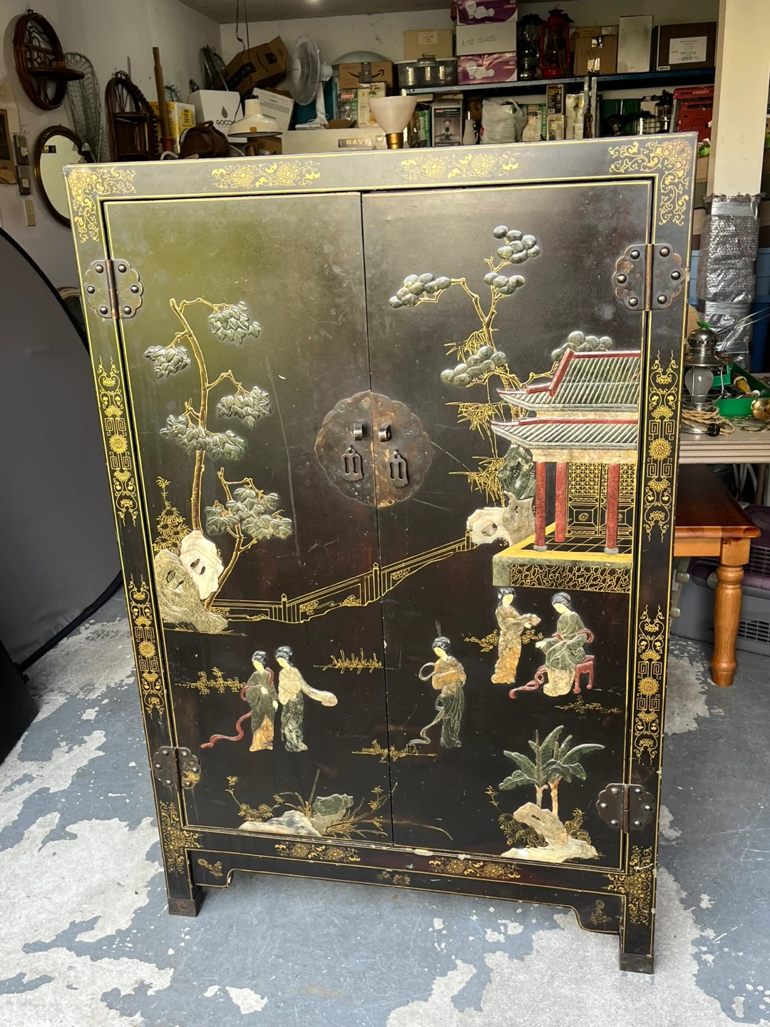 Black Lacquered Chinese Cabinet with Carved Stone Inlay. Cabinet has a bit of damage on some spots but nothing major.