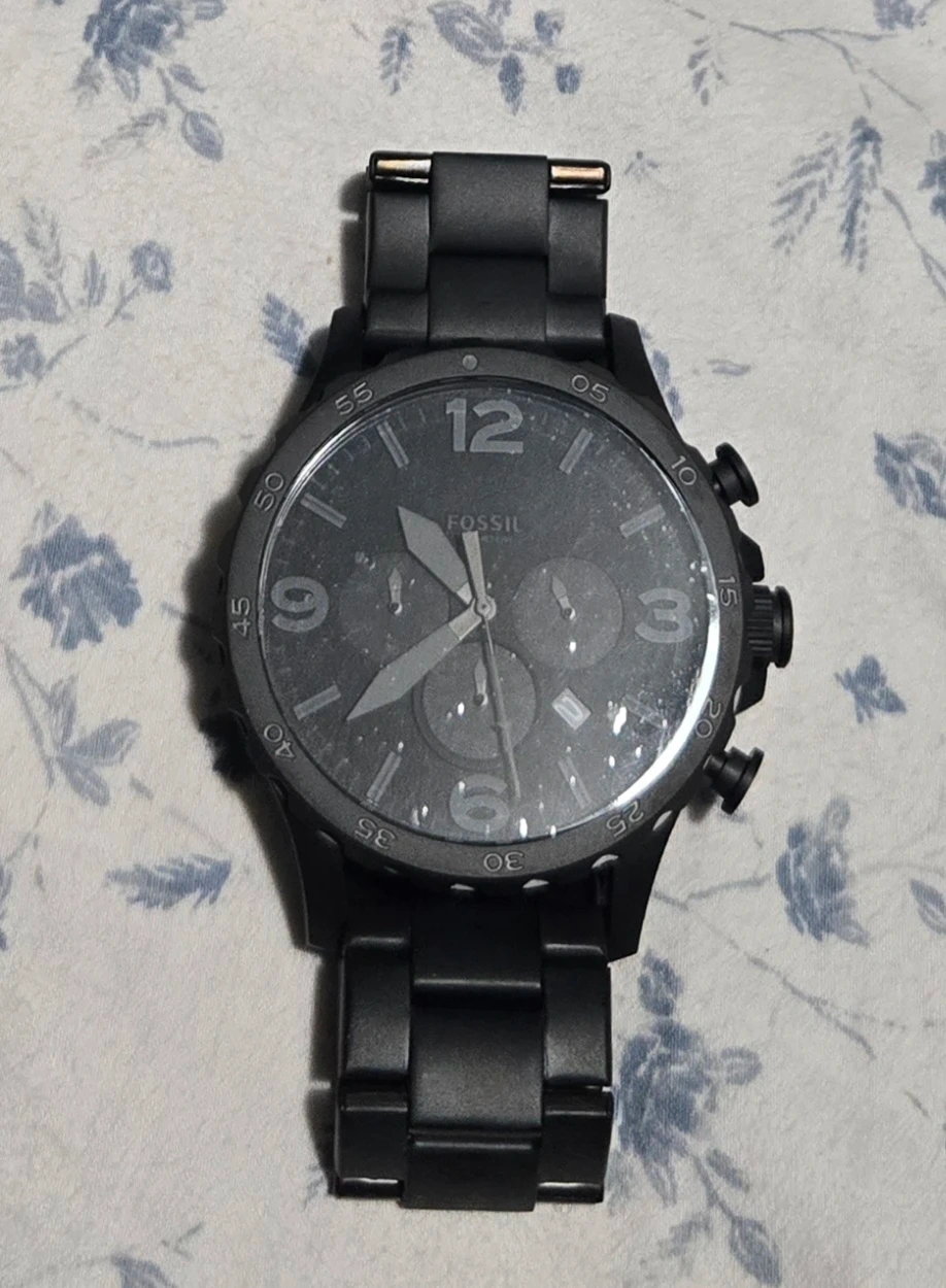 This black stainless steel Fossil chronograph watch features a detailed dial with multiple subdials. It's a stylish timepiece for everyday wear.