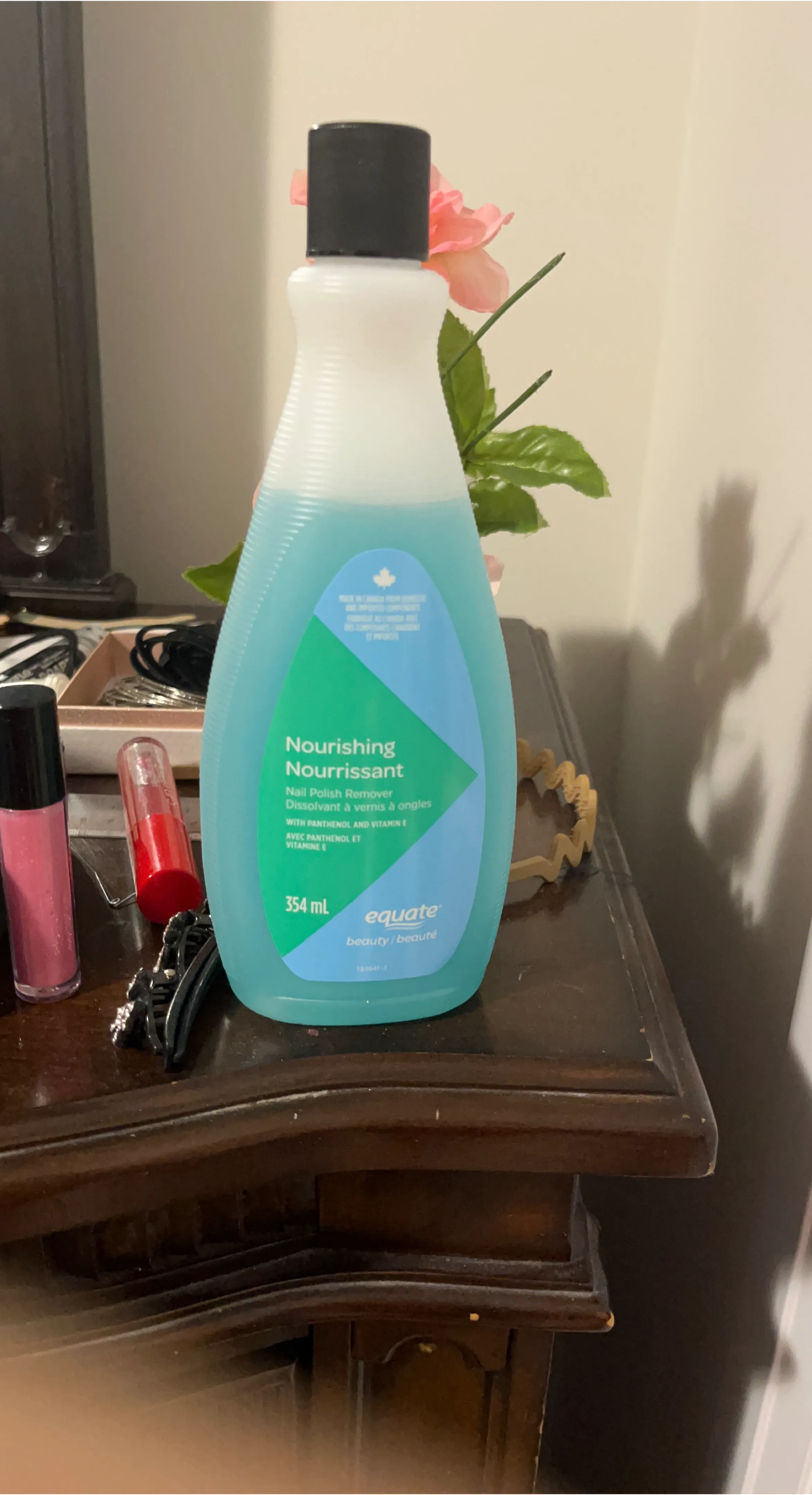 Equate Nourishing Nail Polish Remover. It's formulated with Panthenol and Vitamin E. 354 mL bottle.