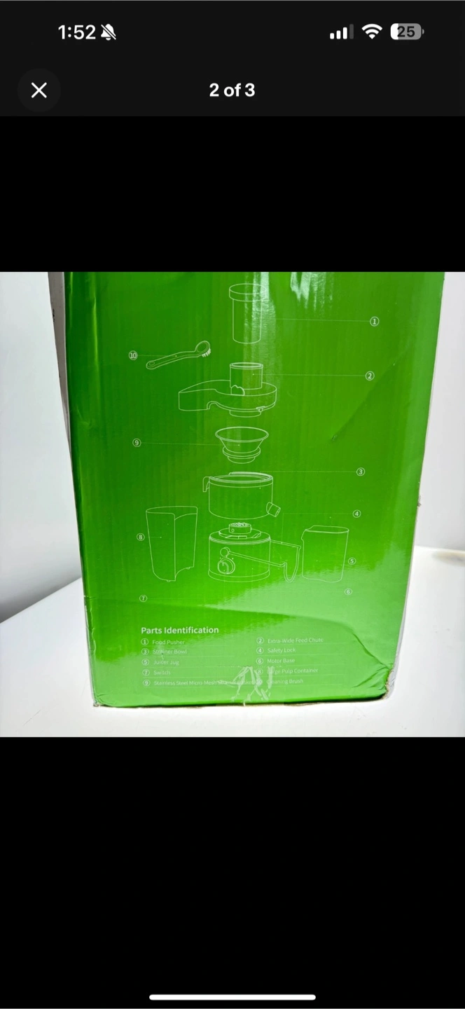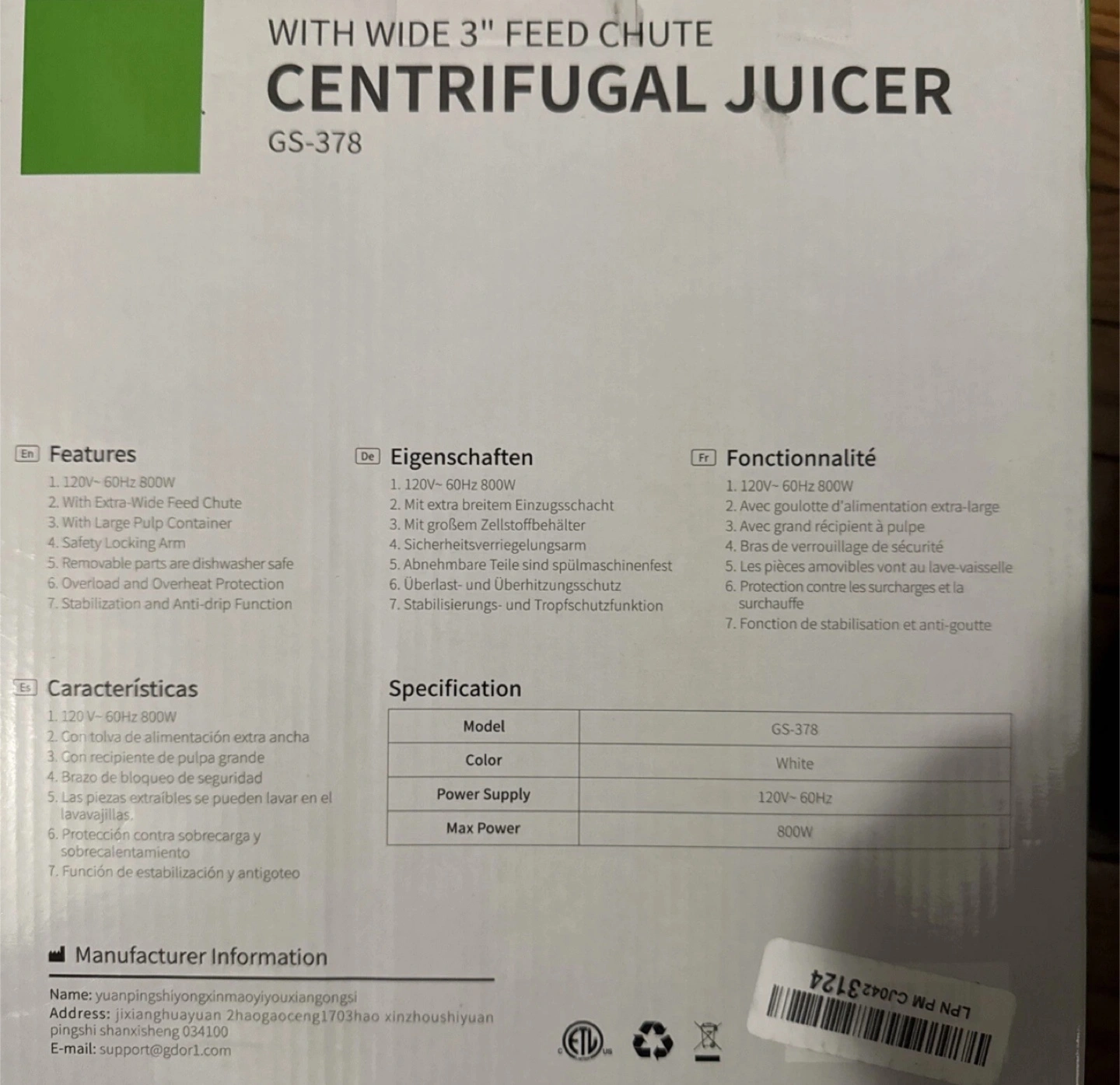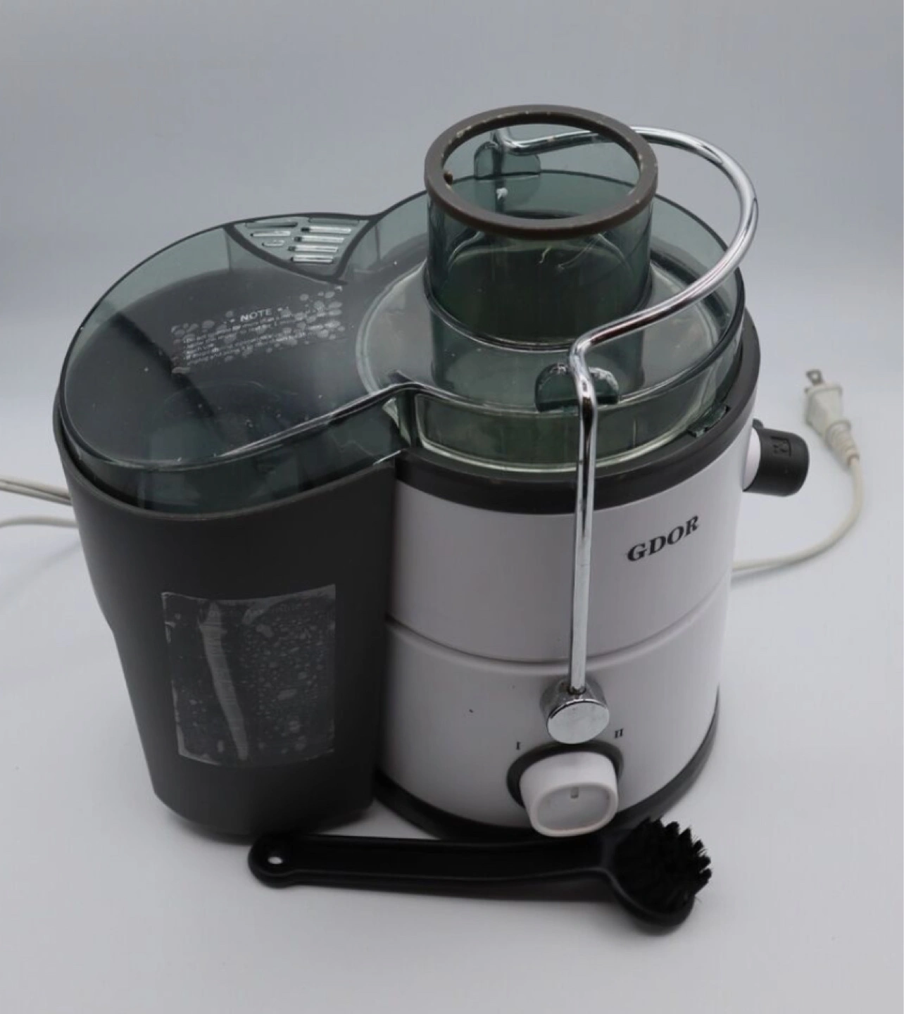 I'm selling a GDOR Centrifugal Juicer, model GS-378. It features a wide 3" feed chute and has a power of 800W. This juicer can extract 27% more juice and 38% more vitamins and minerals. It also comes with a cleaning brush. The box is included!