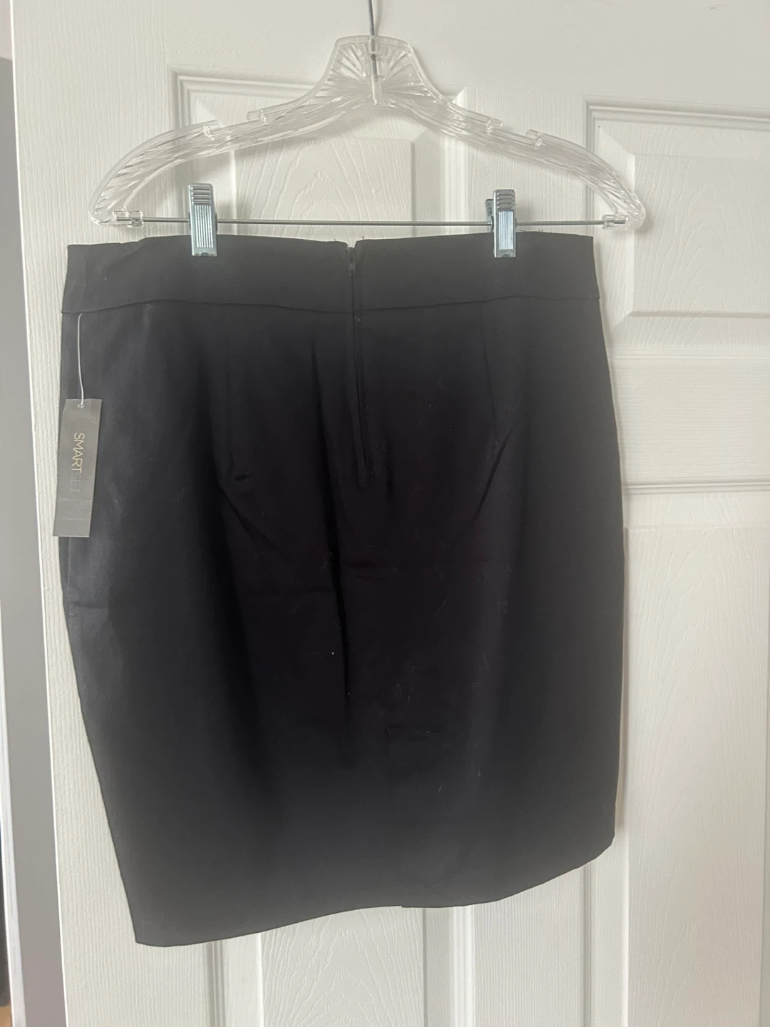 This SMARTSET pencil skirt features a black stretch fabric with a striking white panel adorned with faux black lace detailing. The skirt has a back zipper closure. It's a size 10 with a classic pencil silhouette.
