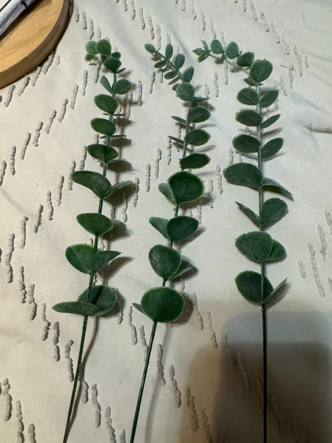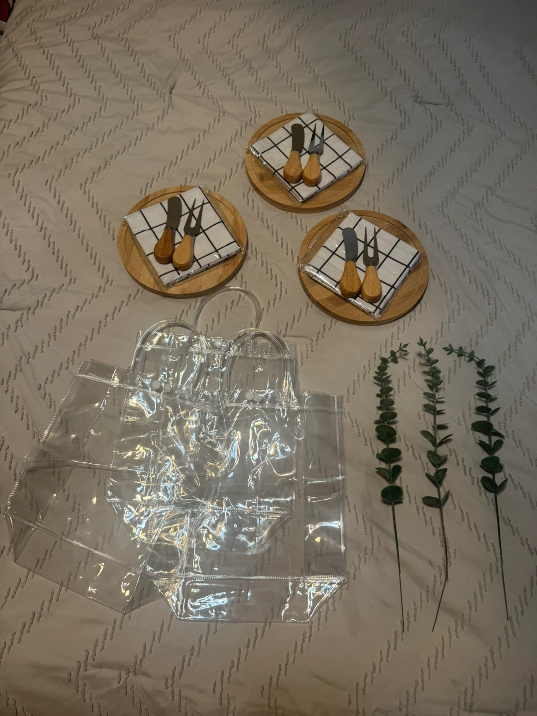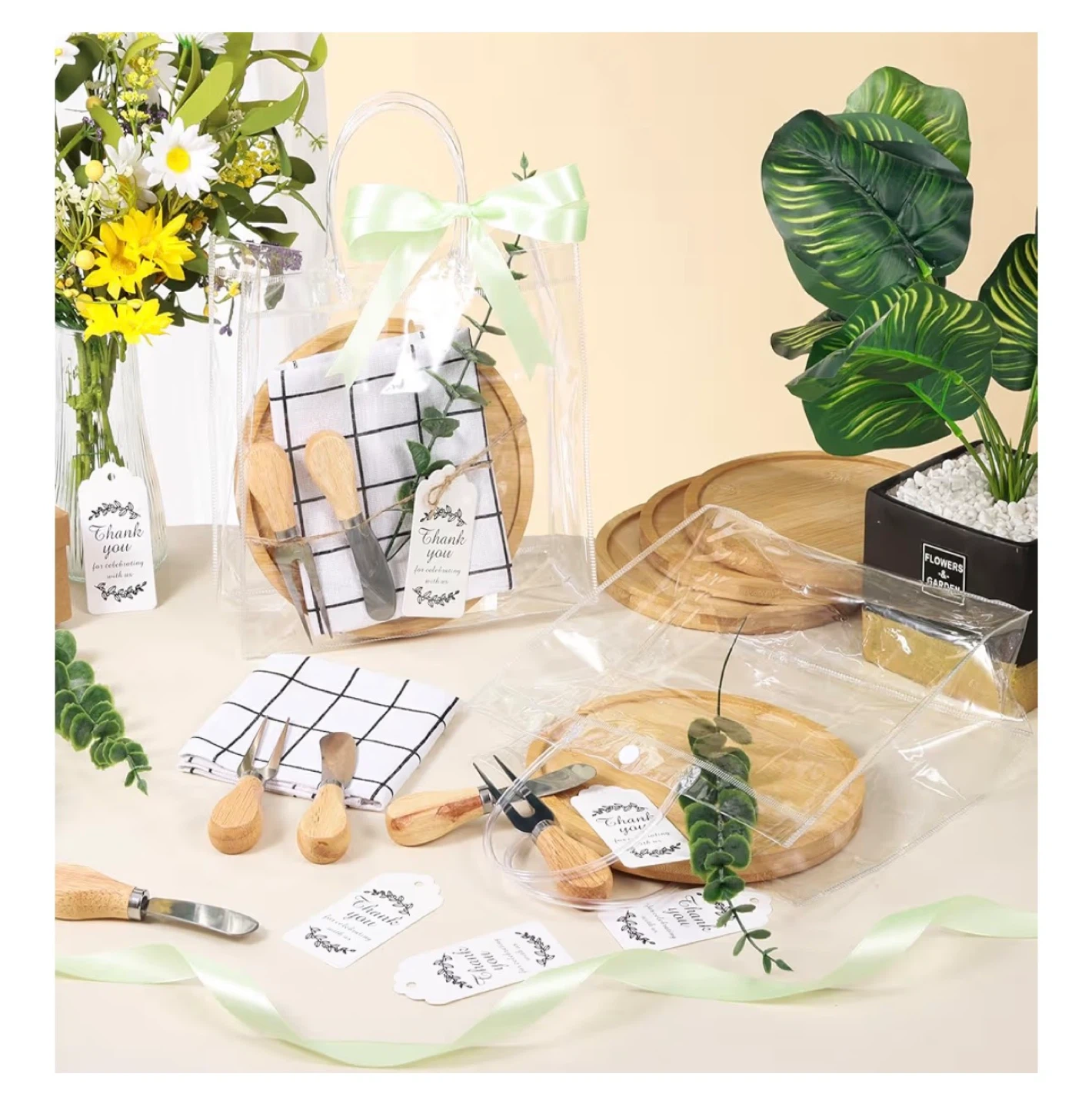 Set of 3 - Small Bamboo Cheese Board, Knife & Fork, Tablecloth, Artificial Eucalyptus Stems and Gift Bags.