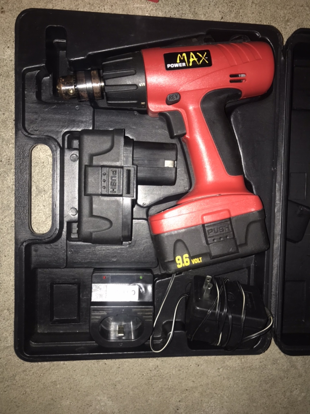 PowerMax cordless drill kit with 9.6 volt battery and charger. Includes the drill, one battery, charger, and power adapter. All pieces are housed in a black carrying case.