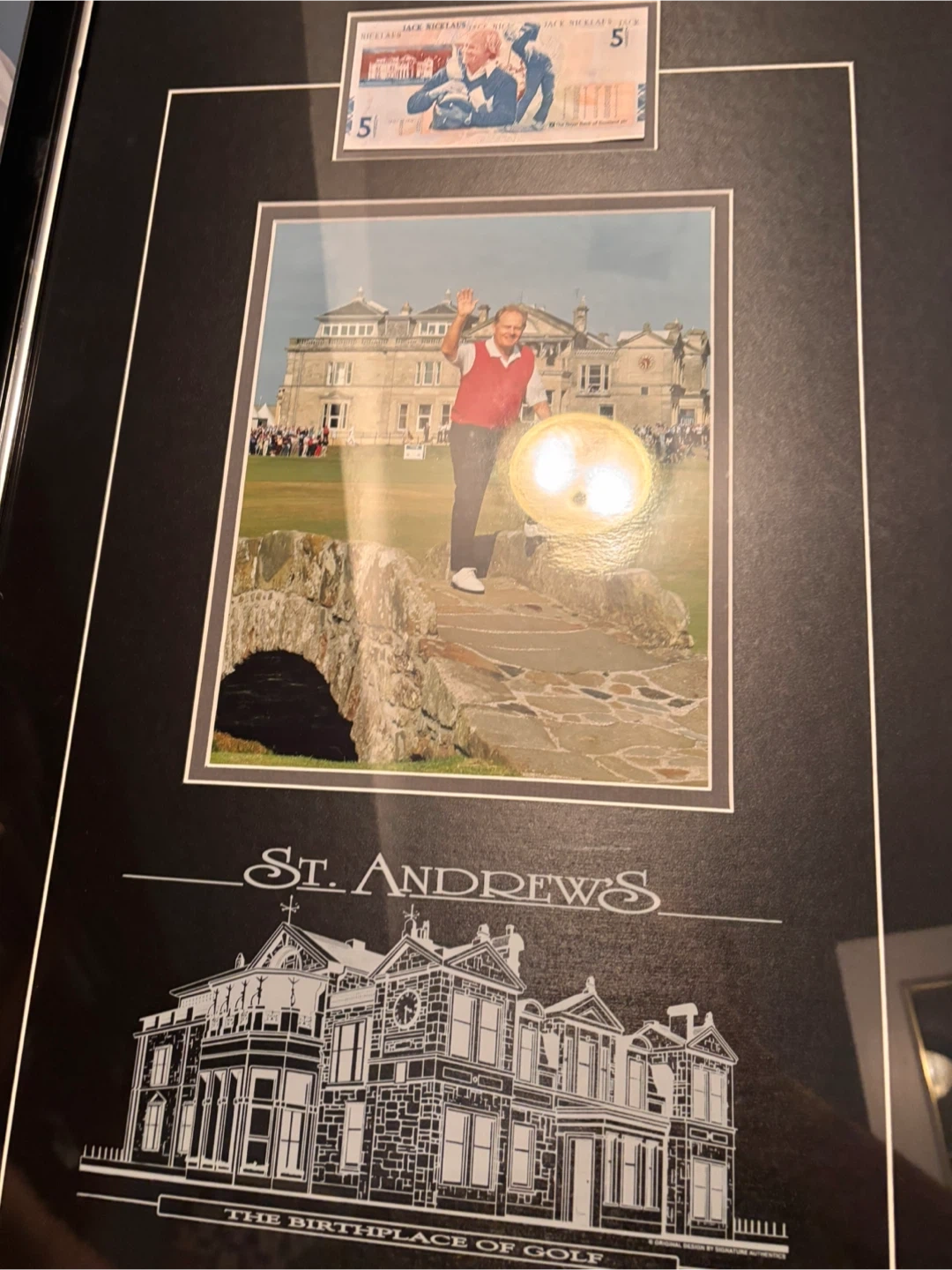 Framed photo of Jack Nicklaus at St Andrews, known as "The Birthplace of Golf"! The image shows Nicklaus crossing the Swilken Burn Bridge during his final British Open appearance on July 15th, 2005. A unique piece for any golf enthusiast!