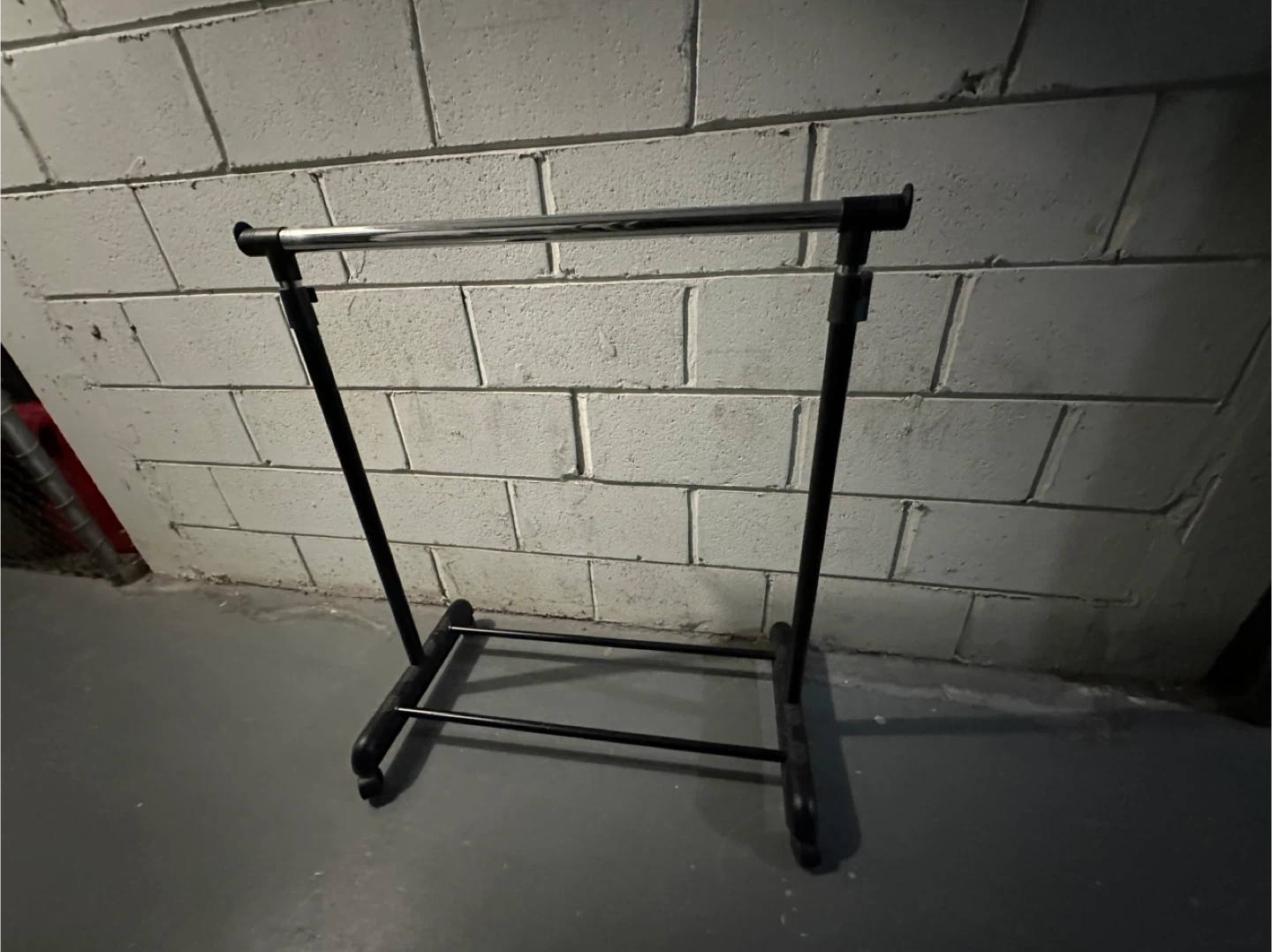 This adjustable clothes rack is perfect for hanging garments. It's made of metal and features adjustable height. This rack offers a simple solution for organizing your closet or extra hanging space. Weighs almost nothing. It’s cheap but great for if you have people over and need an extra coat rack or for displaying clothes at a garage sale maybe. Cheap but will serve its purpose if taken care of. Adjusts to over 5 feet tall!