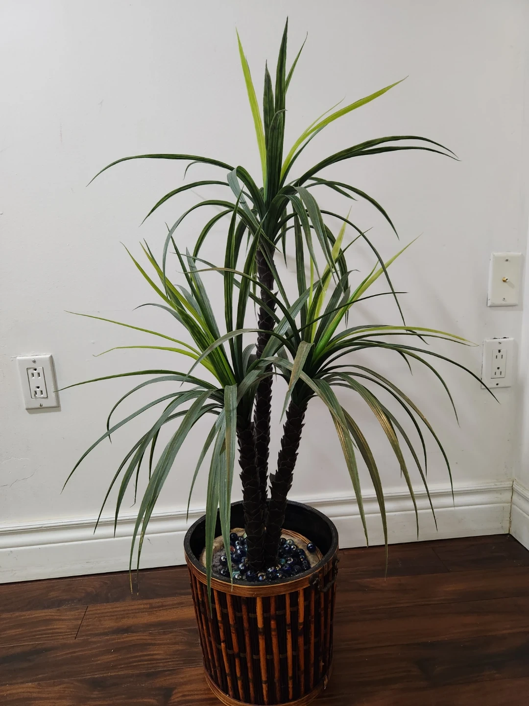 This artificial Dracaena plant stands tall in a unique bamboo-style pot, complete with decorative black stones at the base. It's a low-maintenance way to add some greenery to your space! Its realistic design brings a touch of nature indoors without any fuss.