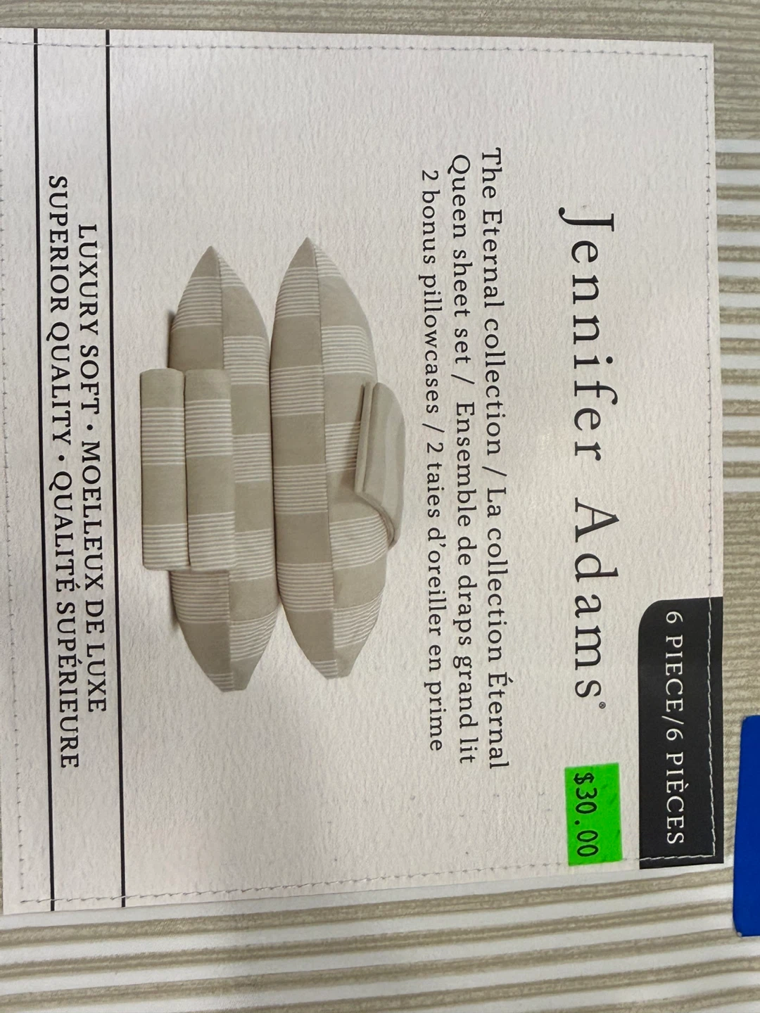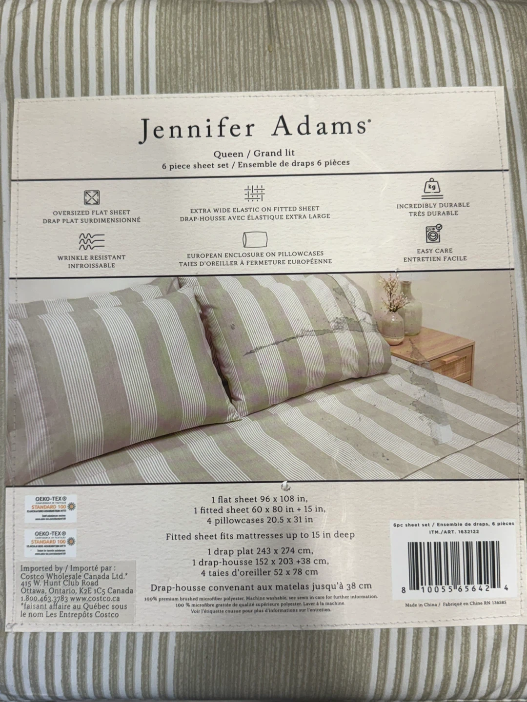 This Jennifer Adams sheet set includes 1 flat sheet (96 x 108 in.), 1 fitted sheet (60 x 80 in. + 15 in. deep), and 4 pillowcases (20.5 x 31 in.). It's made from 100% microfiber for superior softness. The fitted sheet accommodates mattresses up to 15 inches deep. This set is wrinkle-resistant and easy to care for. It's great for upgrading your bedroom comfort and style.