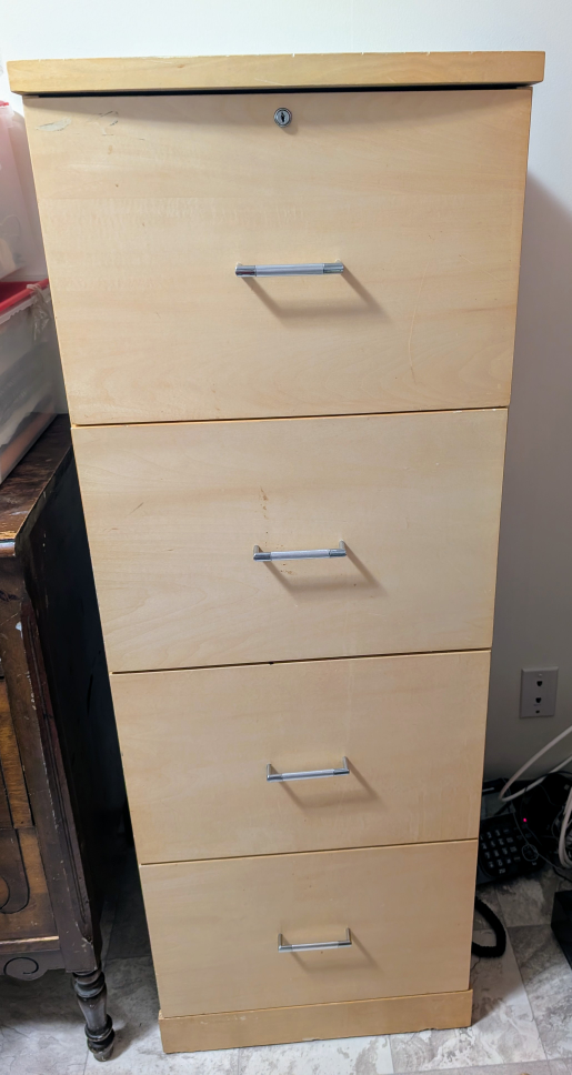 1 / 11 / 1Buy & SellFour-Drawer Filing CabinetFour-Drawer Filing Cabinet$50Four-drawer filing cabinet. Light wood finish. Metal handles. Keyhole on top.ConditionGoodDimensions18.5"W X 18"D X 52"HWHERE TO MEET2981 Jackladder LnView MapSELLERAmyFernwood211 review0 chats·0 favorites·31 viewsSEND CHAT TO SELLERHi Amy! I’m interested in your listing.Hi Amy! I’m interested in your listing.Get the Karrot app to chatSign In to chat