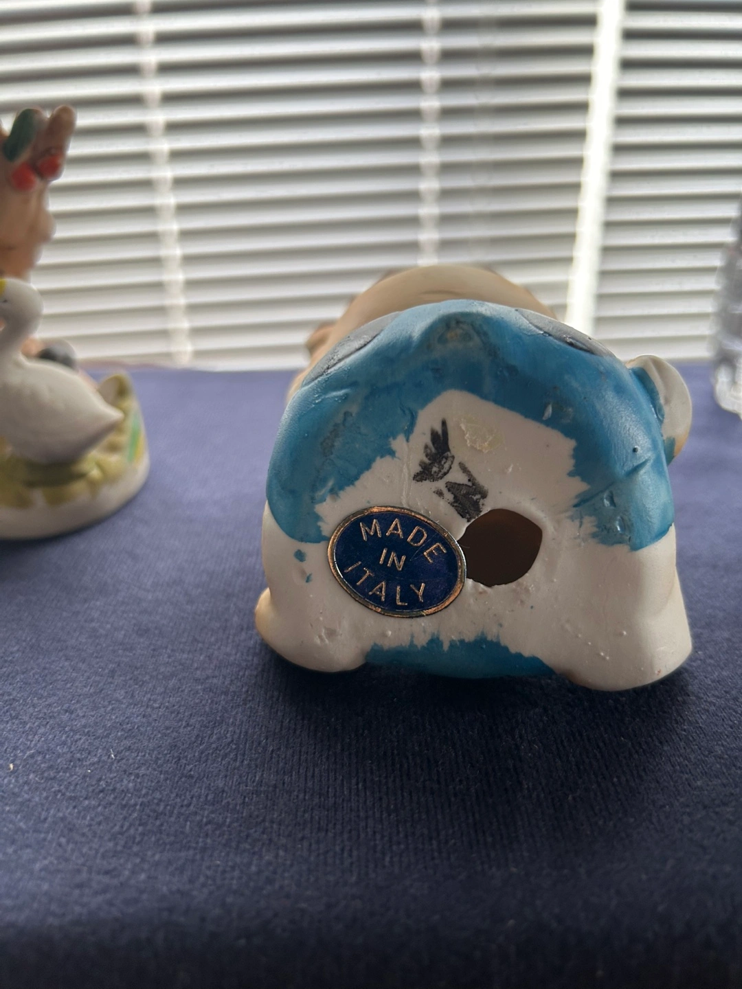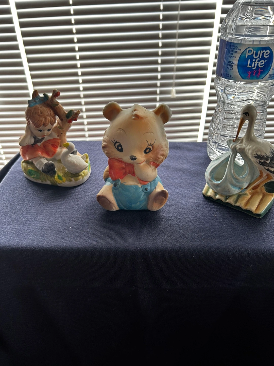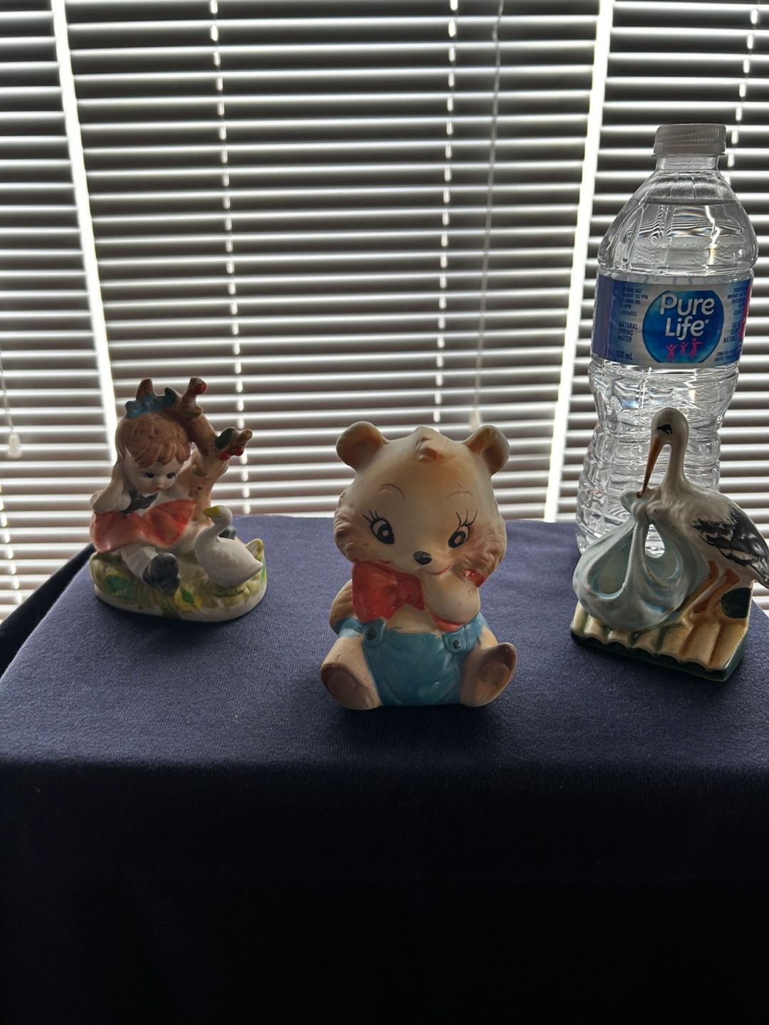 Adorable set of three vintage ceramic baby figurines. Features girl with goose, bear in overalls, and stork with baby. Made in Italy. Collectible, charming, and perfect for a nursery or shelf.