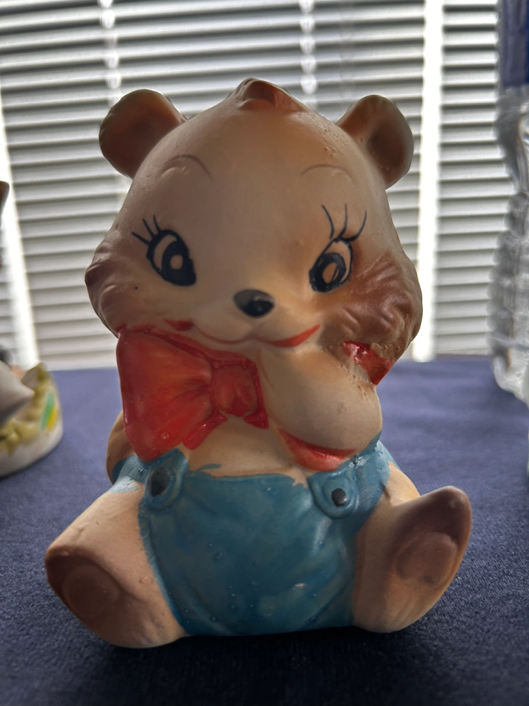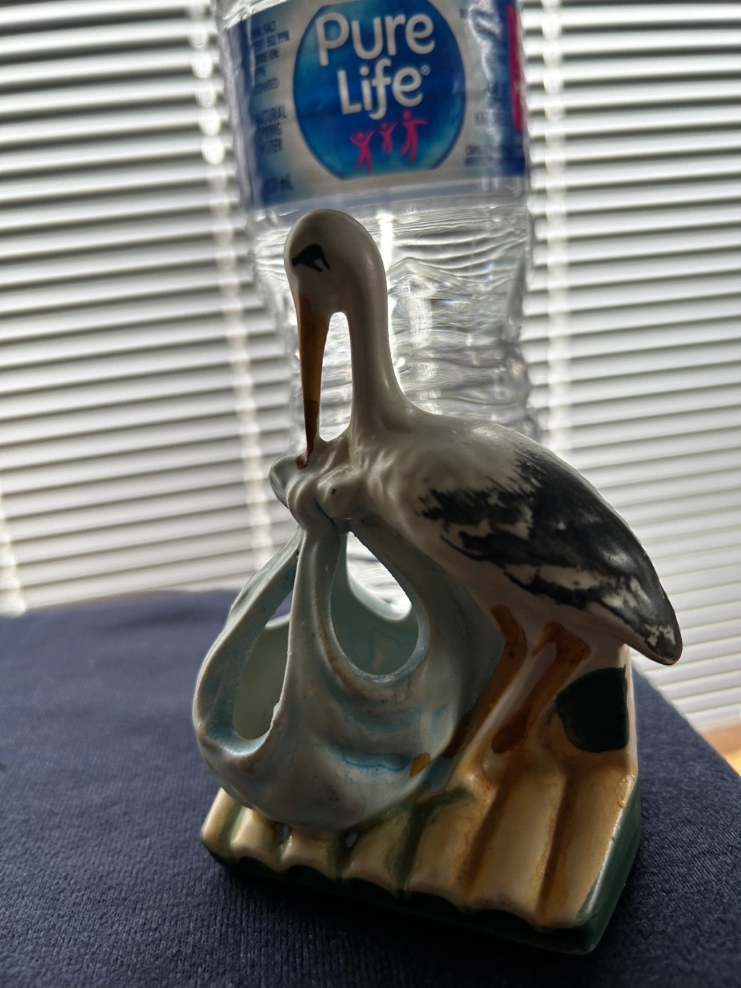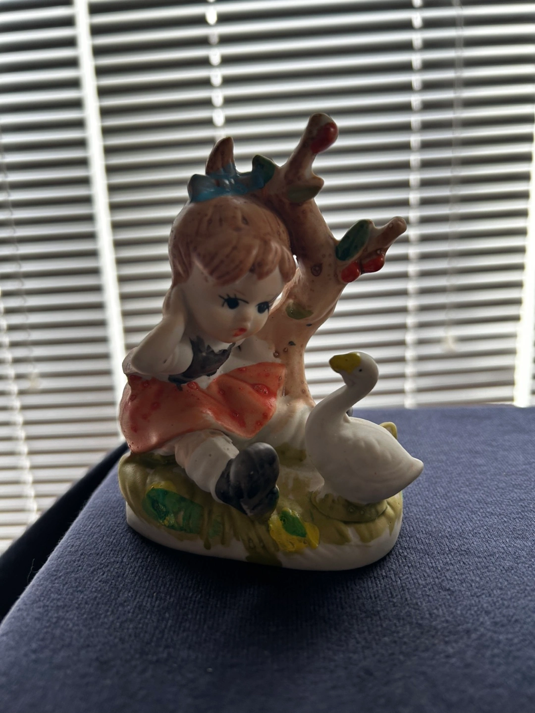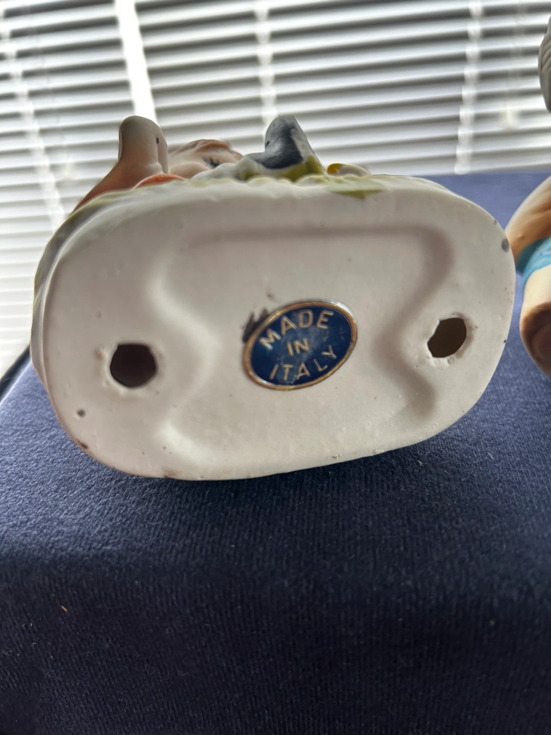 Adorable set of three vintage ceramic baby figurines. Features girl with goose, bear in overalls, and stork with baby. Made in Italy. Collectible, charming, and perfect for a nursery or shelf.