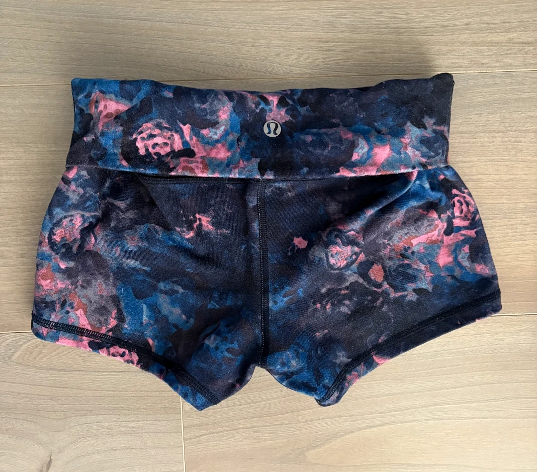 Lululemon Wunder Under Shorts with a blue & pink multicoloured pattern