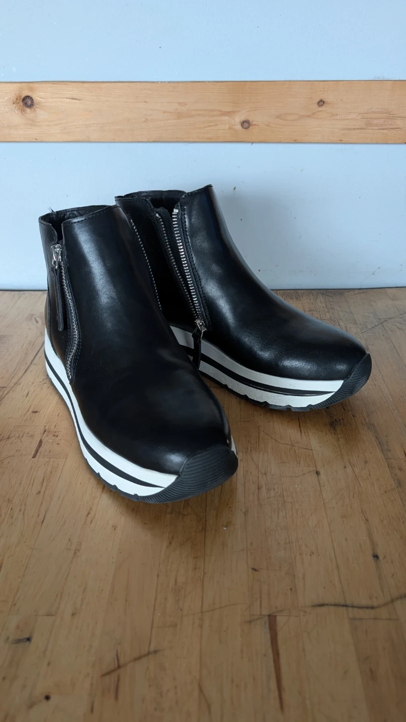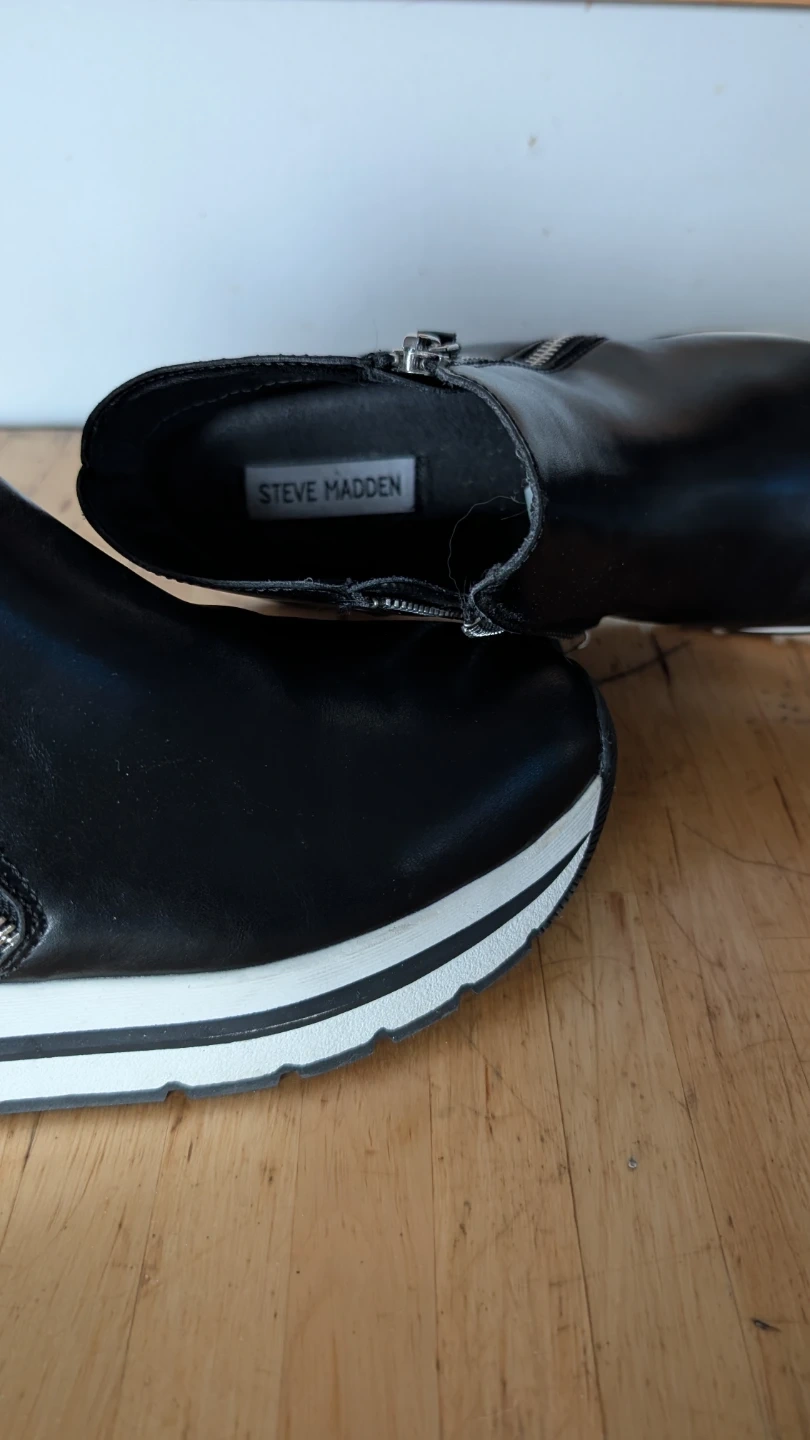 Steve Madden. Extremely well constructed leather uppers in blue black. The leather is a semi gloss finish. The sole is a solid, sturdy platform approx 2 inches made from a dense rubber that still provides for easy, comfortable movement.The rubber platform is layered with a black and white horizontal stripe and has a rubber cap detailing at the toe.The shoe has only been worn once on the runway, they're practically new except for one wear. They are a medium width. The leather bootie cradles the foot comfortably. Size 8.5. True to size.