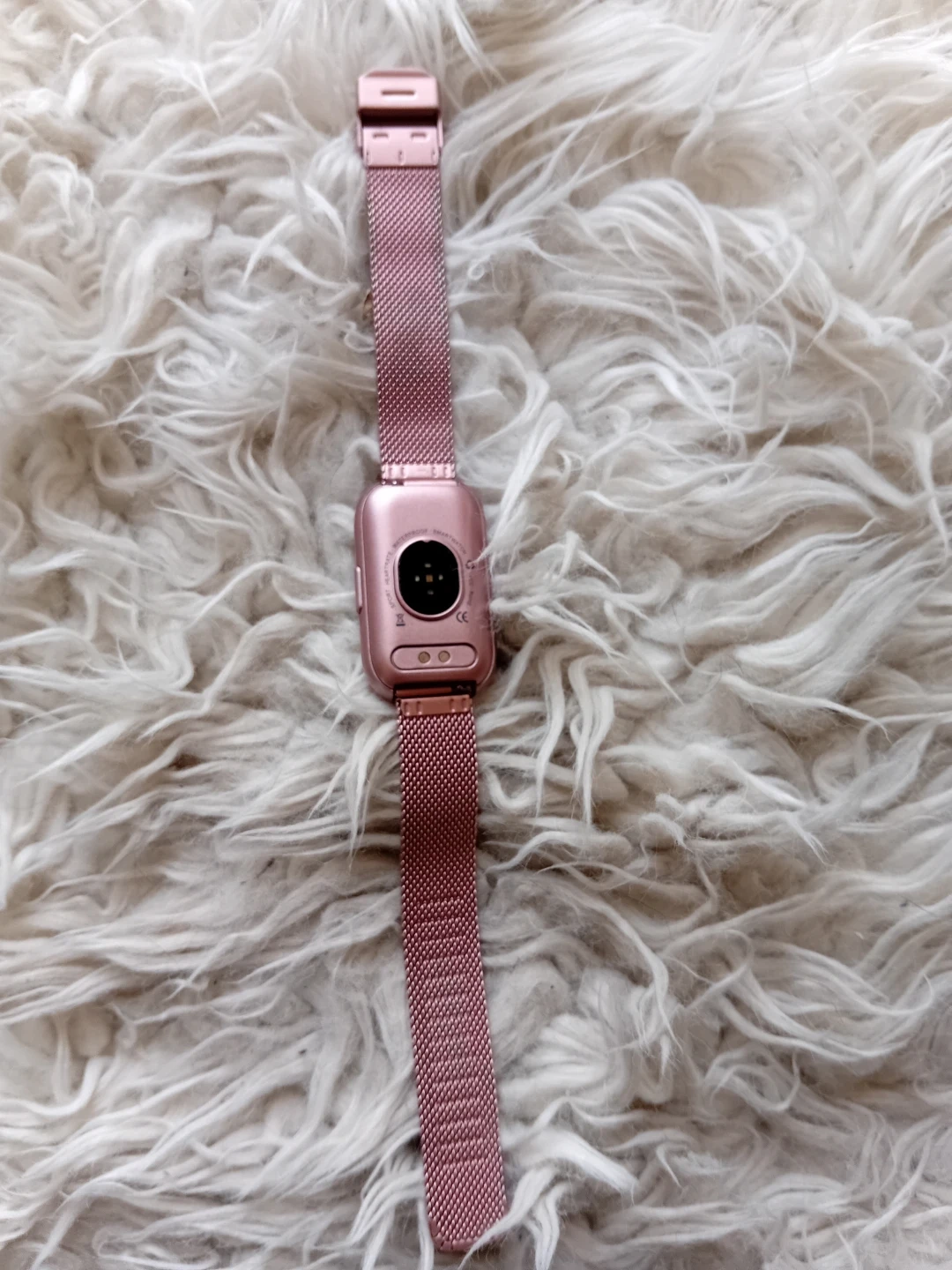 This rose gold smartwatch features a sleek mesh metal band. It's a stylish accessory for tracking your daily activity. The band is adjustable for a comfortable fit.
