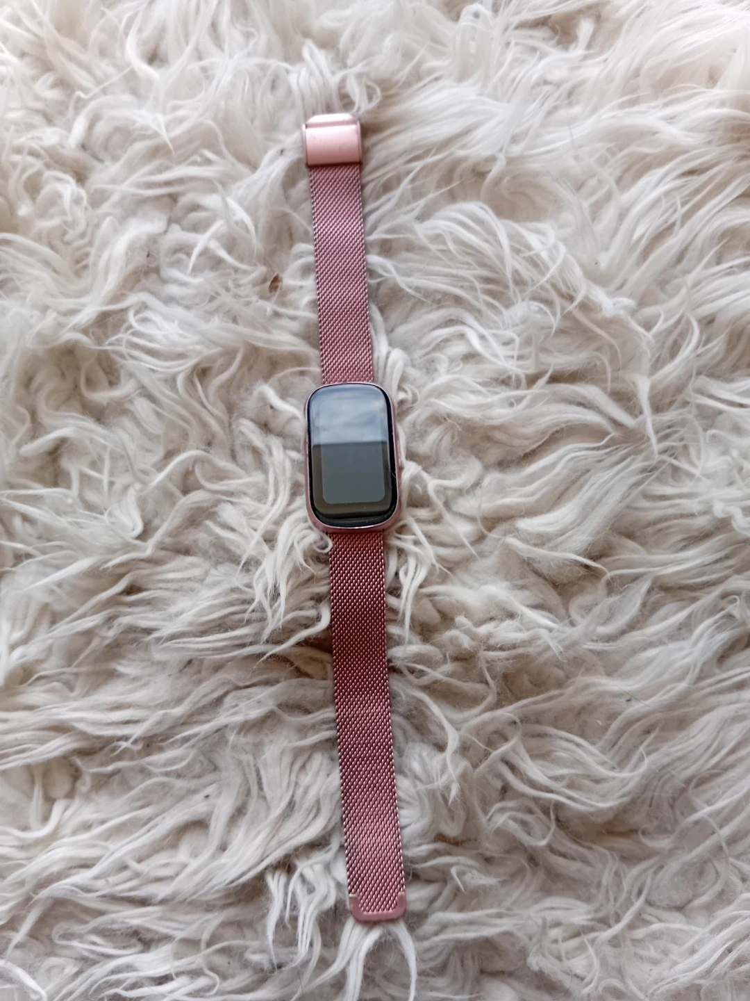 This rose gold smartwatch features a sleek mesh metal band. It's a stylish accessory for tracking your daily activity. The band is adjustable for a comfortable fit.