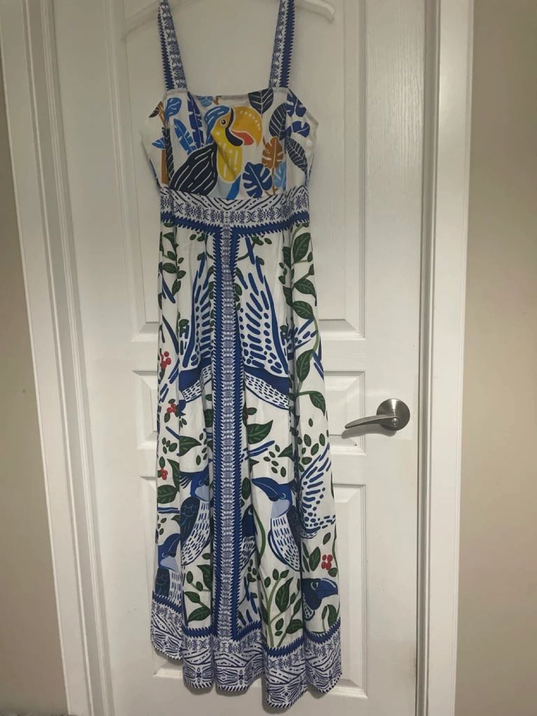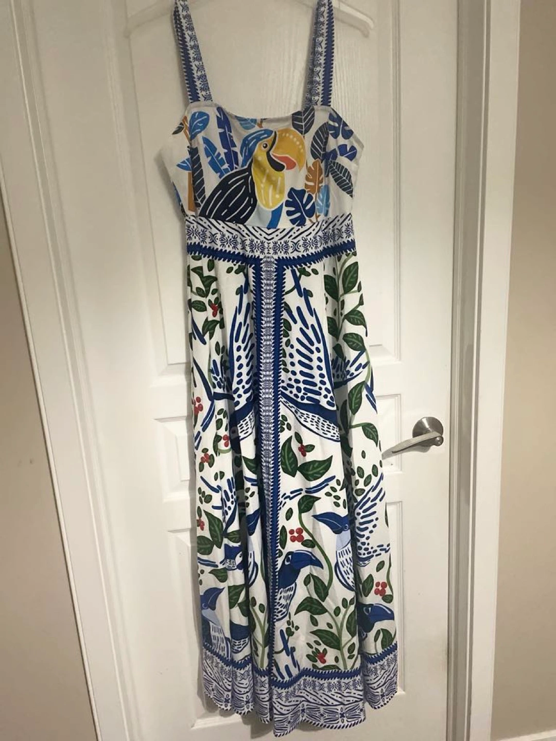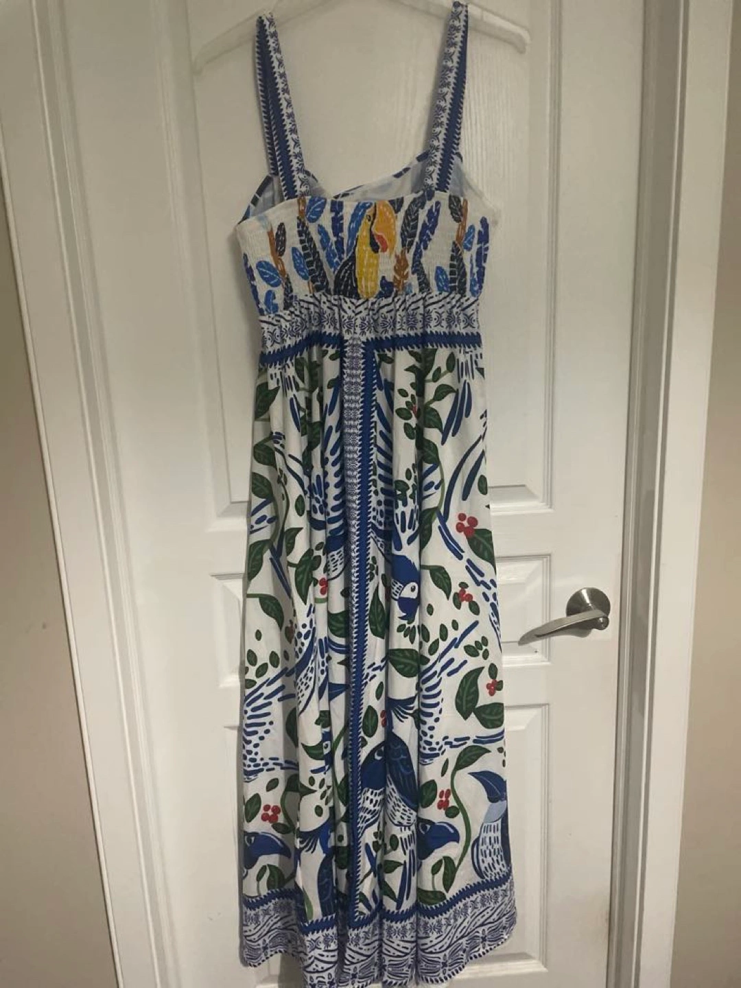 Beautiful maxi dress, vibrant colours. Features a colourful bird and floral print. Adjustable straps. Flowy and comfortable. Perfect for summer.