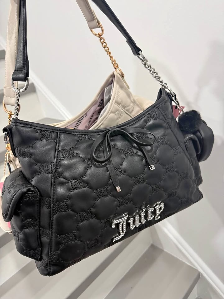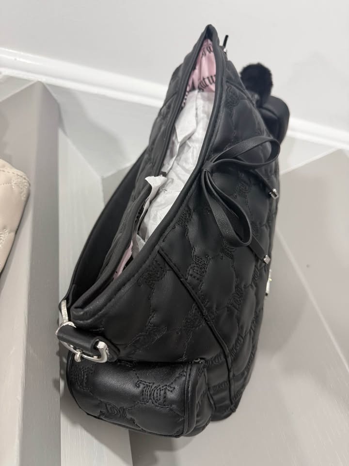 Brand new Juicy Couture shoulder bag. Black quilted design with a rhinestone logo on the front. Features a bow detail and a fuzzy black pom-pom charm. The shoulder strap has chain accents and the interior is lined in pink. Still has the original tissue paper inside.