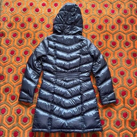 Women's size Small blue Calvin Klein packable puffer coat. It comes with a pouch to pack it. Note that this is a rip/tear that was repaired/sewn on the front, below the right pocket. Please refer to the last photo. Otherwise in great condition. Pick up at Yonge & Sheppard.