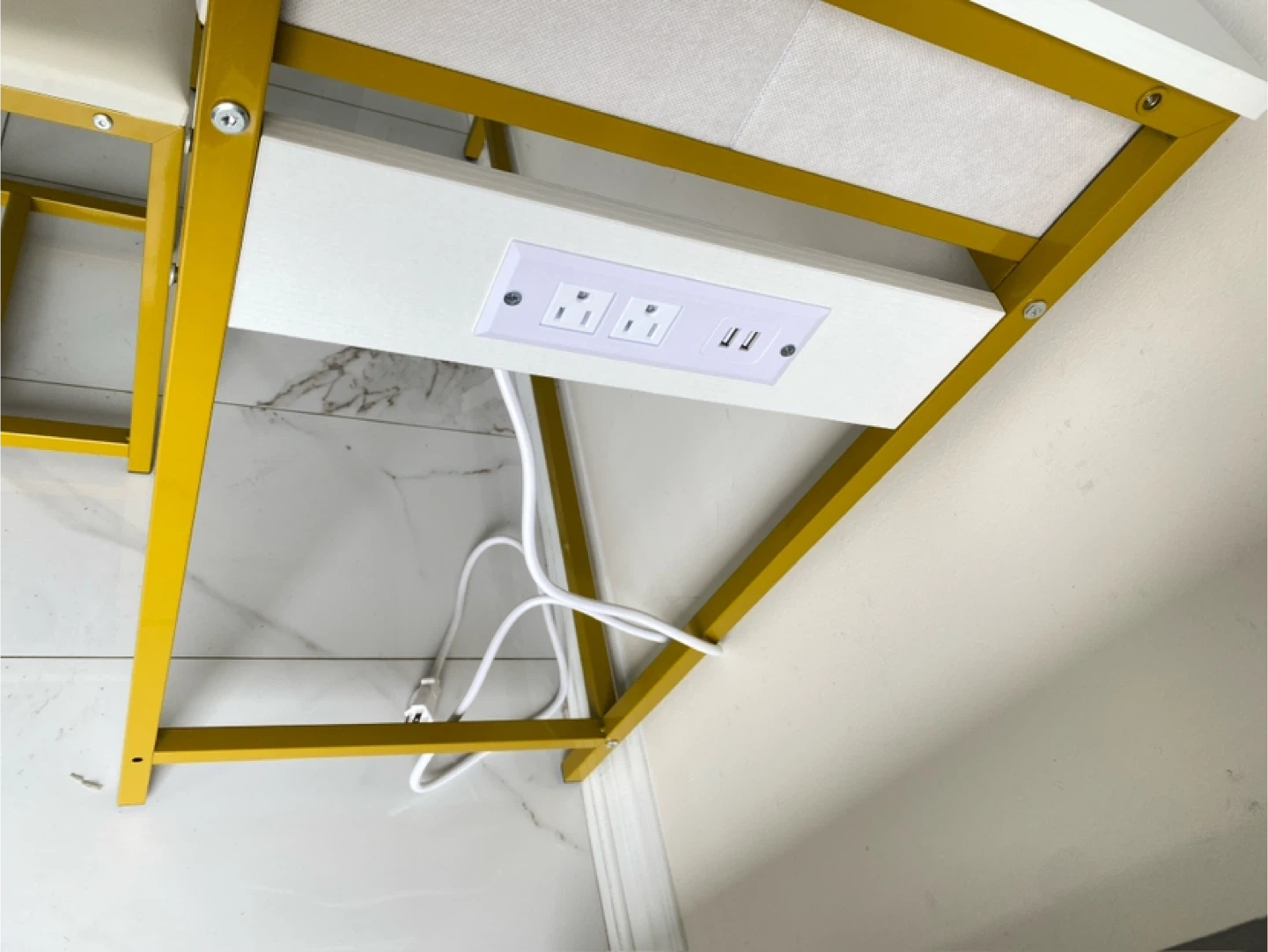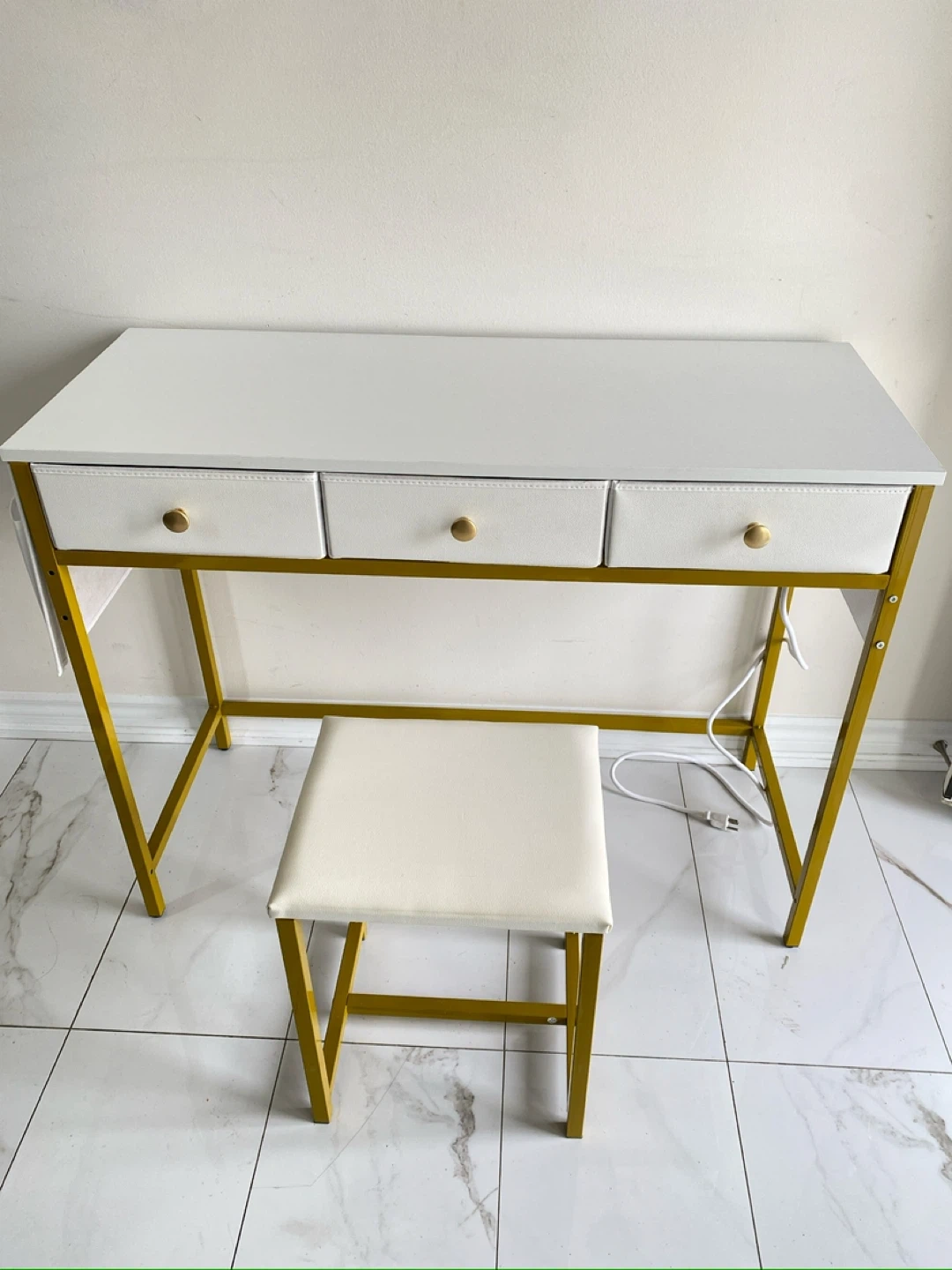 This vanity set includes a white desk with three drawers and a matching stool. The desk has a sturdy gold metal frame and gold hardware on the drawers. It's a great addition to any bedroom or dressing area!