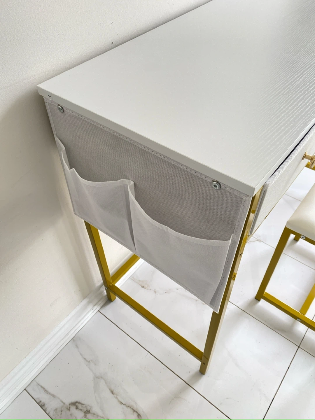 White Vanity Desk with Stool and Gold Legs