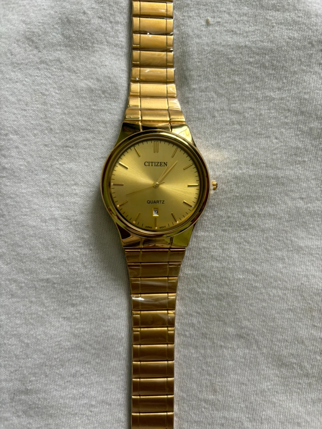 This is a classic gold-tone Citizen quartz watch. It features a clean, sunburst dial with a date complication. The bracelet is also gold-tone metal. It's a reliable timepiece.