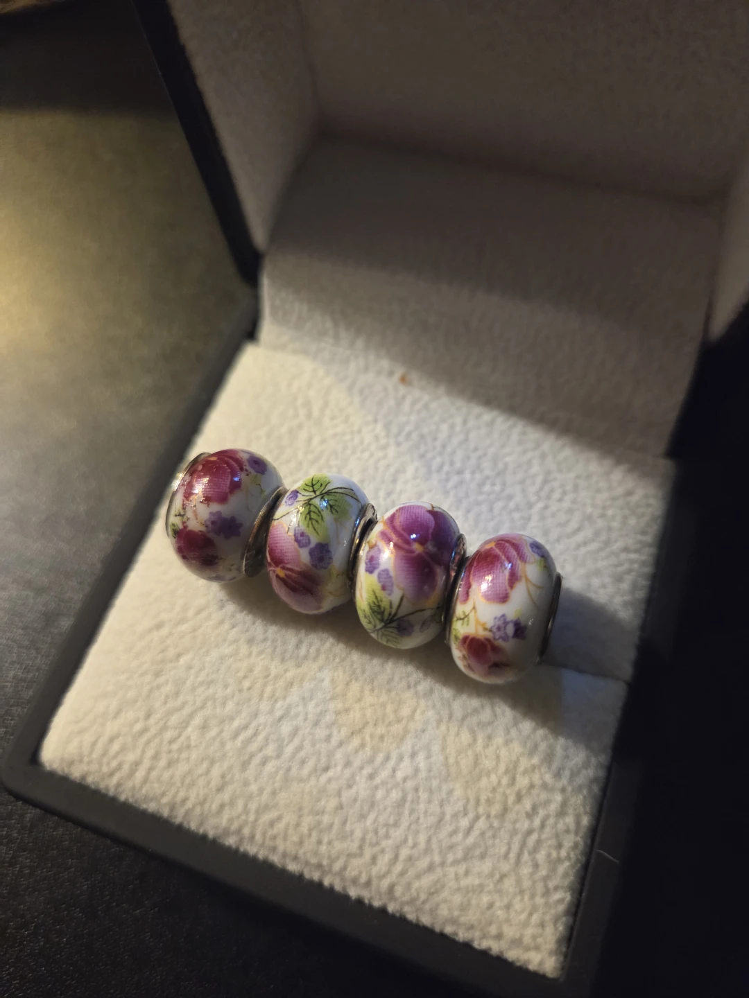 Four ceramic charms with a floral design. Each charm has a 925 sterling silvercore and a hole for stringing to Pandora bracelet