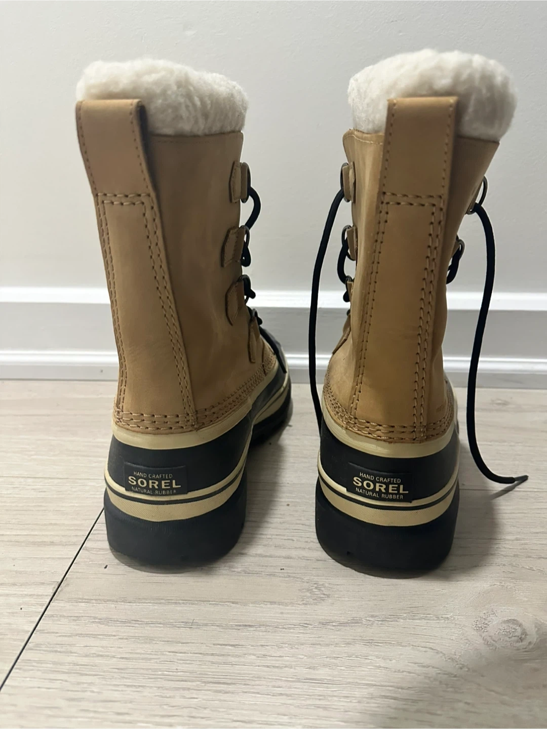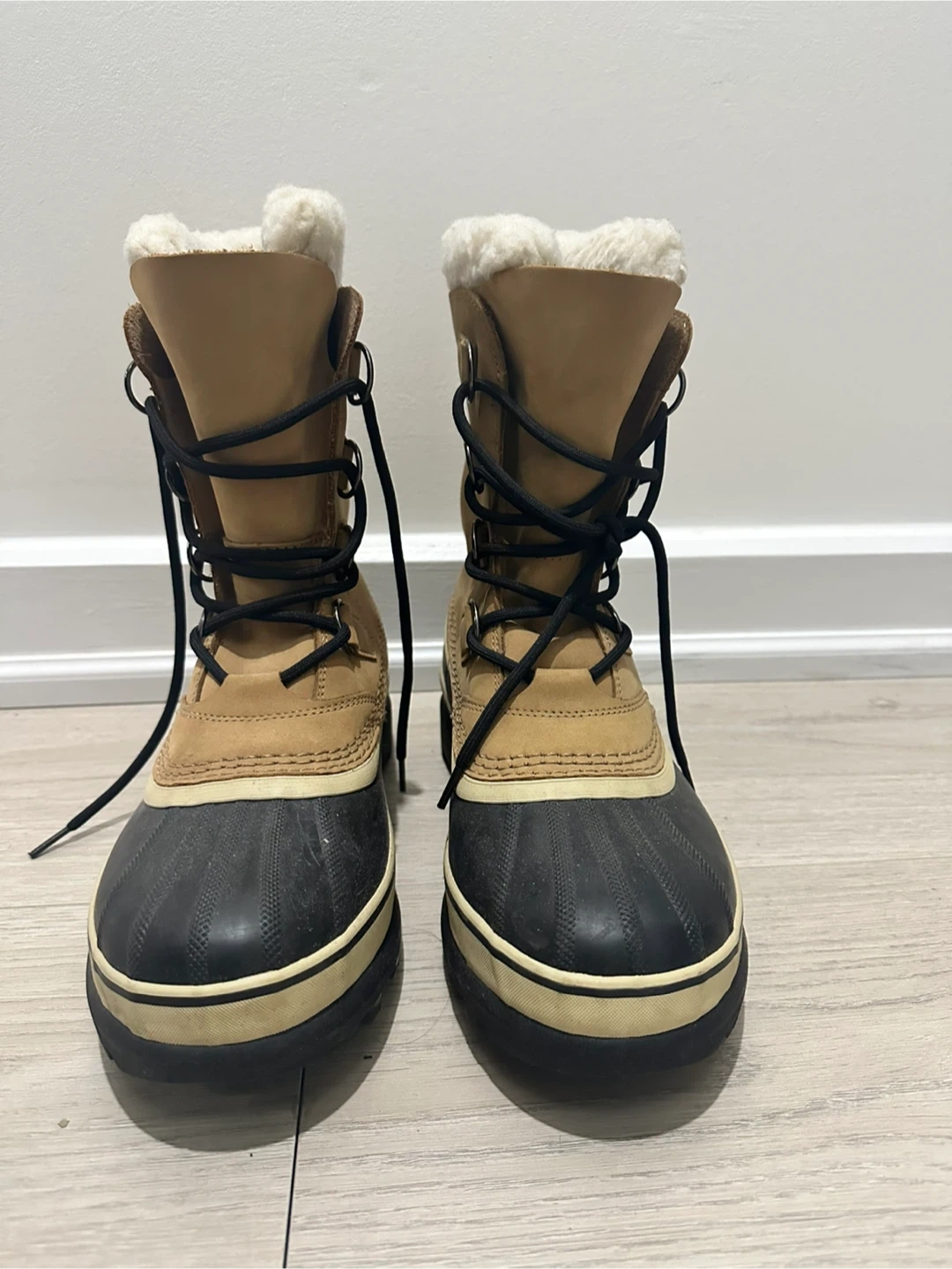 Cozy women’s Sorel winter boots. Tan upper with black rubber bottom. Has fluffy white lining, super warm for cold weather. Waterproof. Size US9 / UK7.