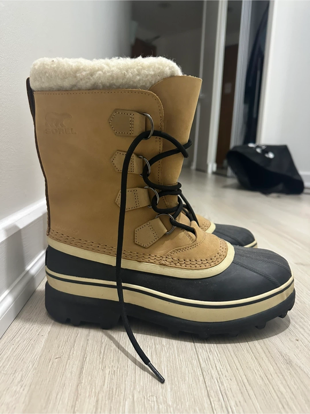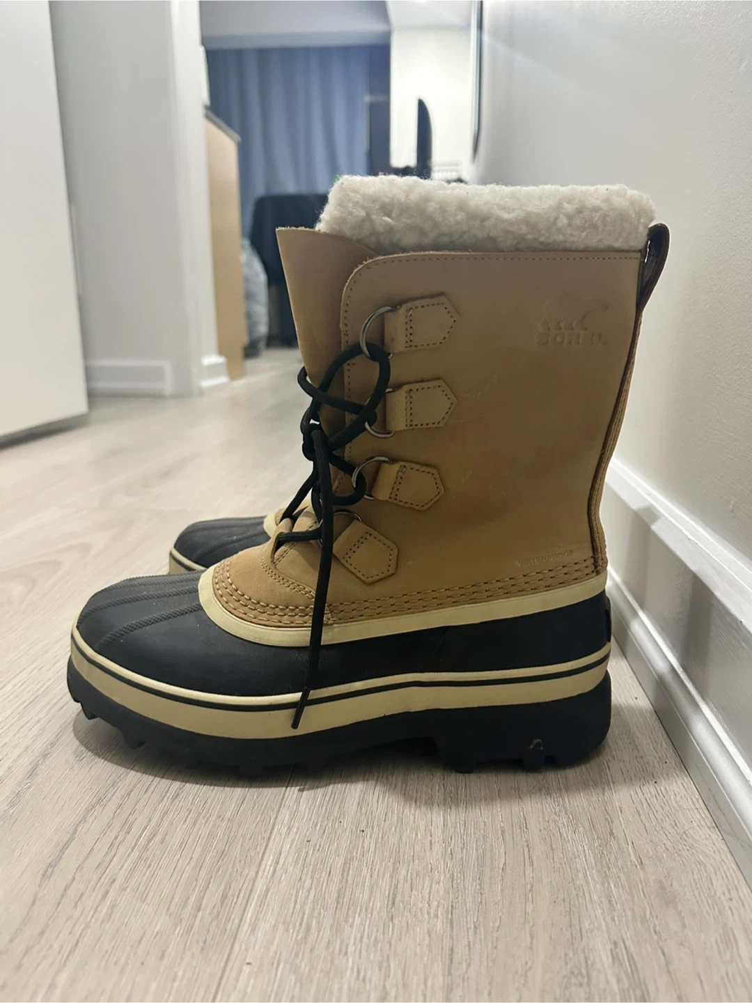 Cozy women’s Sorel winter boots. Tan upper with black rubber bottom. Has fluffy white lining, super warm for cold weather. Waterproof. Size US9 / UK7.