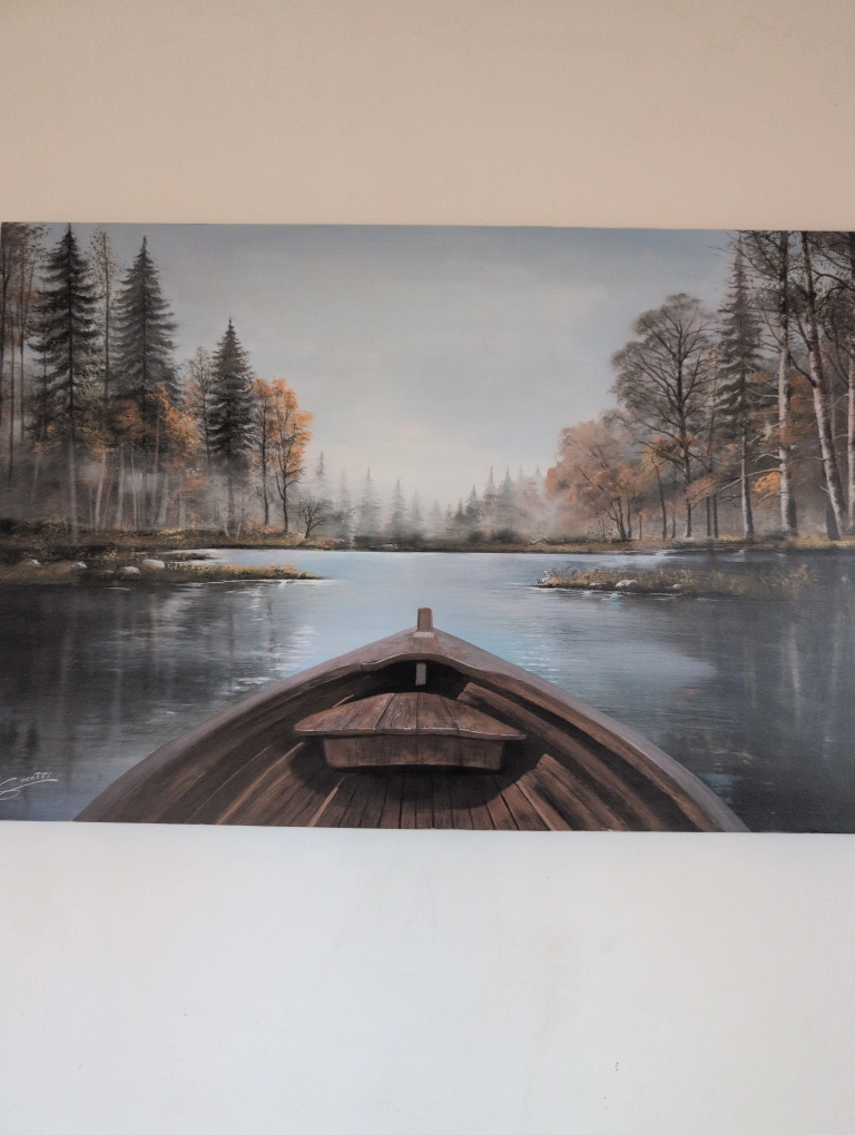 Large canvas painting. Depicts a rowboat on a calm lake surrounded by autumn trees. Beautiful colours and detail. Perfect for home décor.